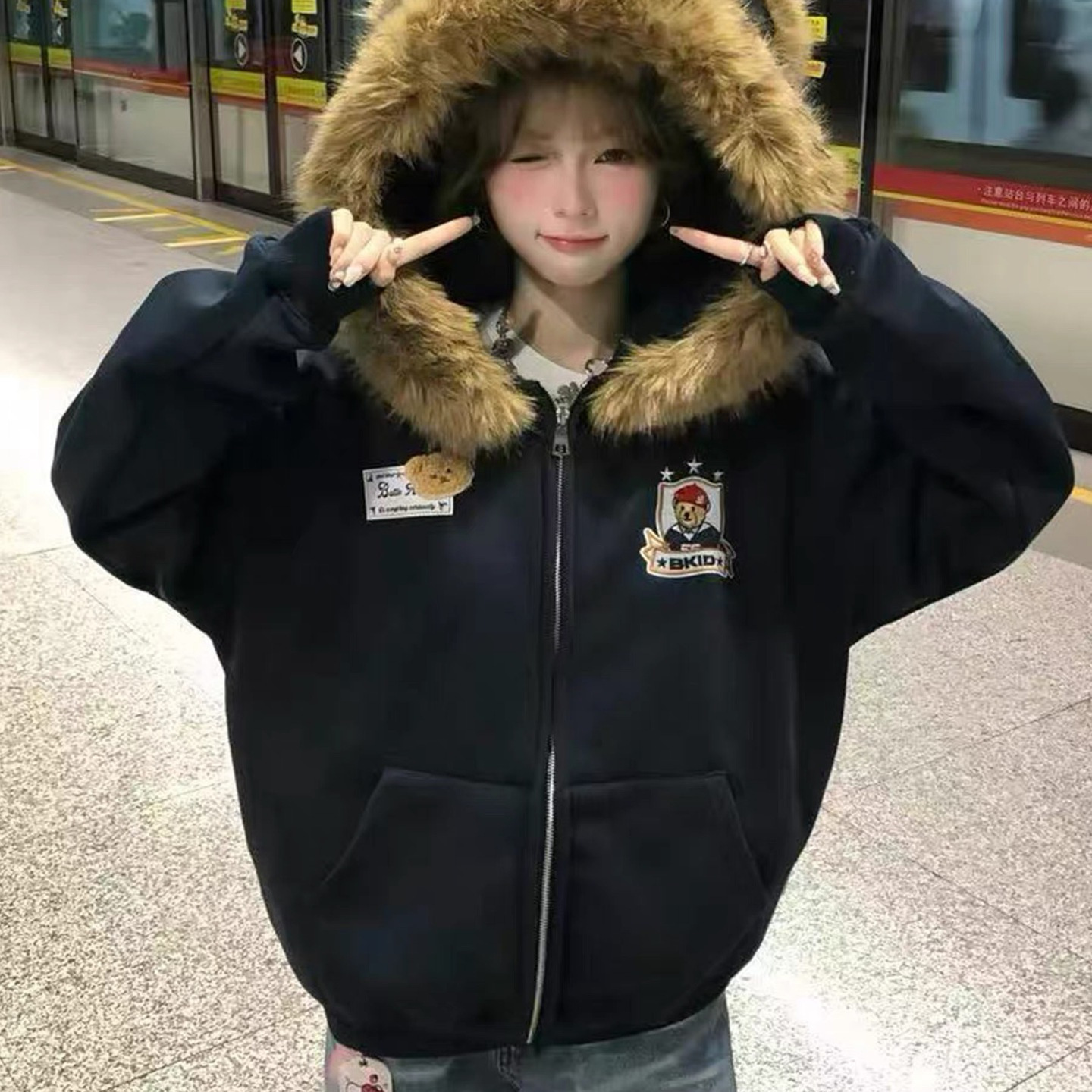 可爱小熊耳朵毛绒领卫衣女秋冬加绒新款宽松慵懒风连帽外套ins潮