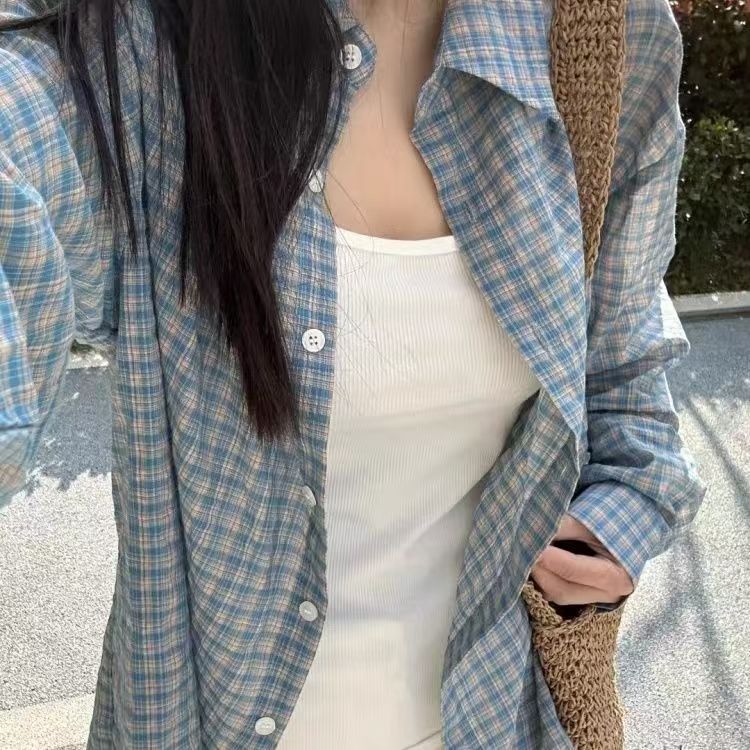ブルーチェック柄レイジー長袖日焼け止めシャツ新しい韓国スタイルのルーズ薄手のシャツジャケット多用途カジュアルトップ
