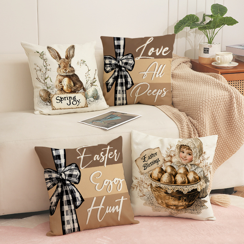 TEMUホット贩売イースターハッピー抱き枕カバーカラフルな卵ウサギ装饰リネン汚れに强いホームソファクッションクッション