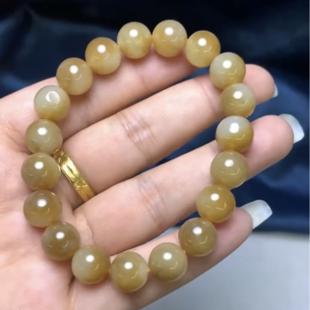 天然和田玉 新疆且末糖白10mm手链和田玉糖料圆珠金黄色手串 批发