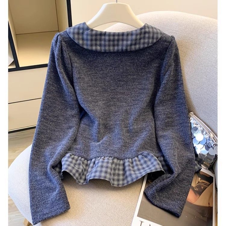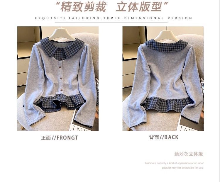 格子荷叶边系带假两件长袖秋冬2025新款宽松显瘦短款打底衫上衣女