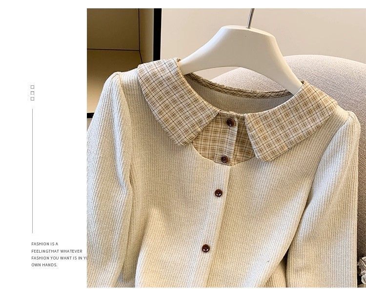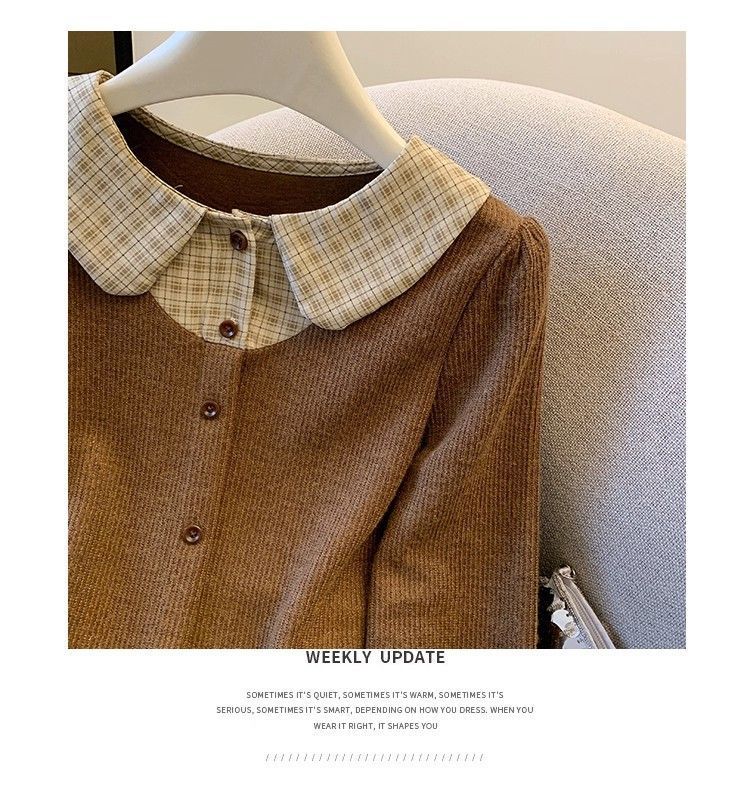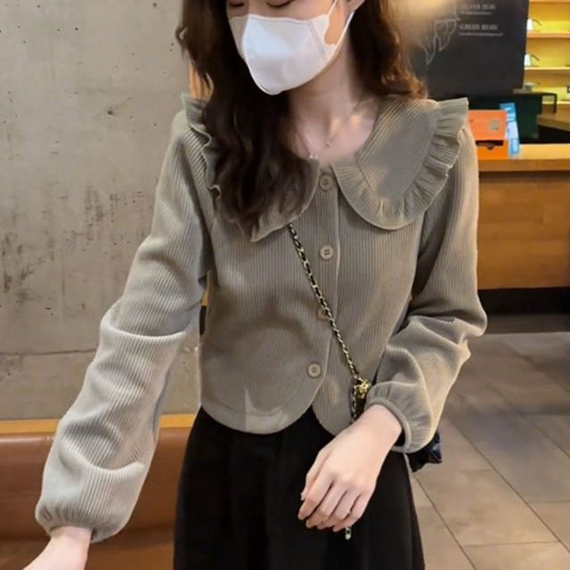子供の襟のコーデュロイのシャツの上着の女性の秋冬のデザイン感の小さい大衆のファッションの洋風の中でシャツを掛けて底の小さいシャツを打ちます。