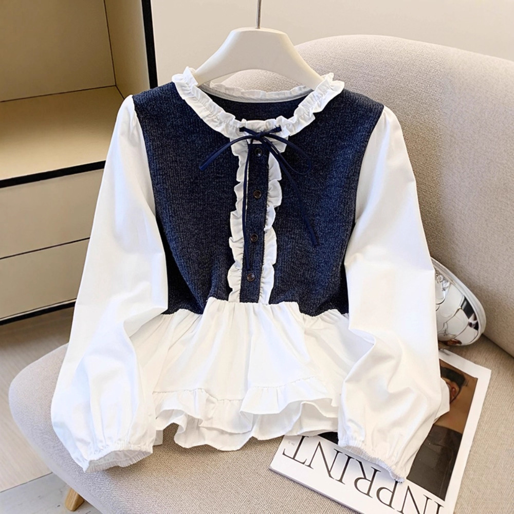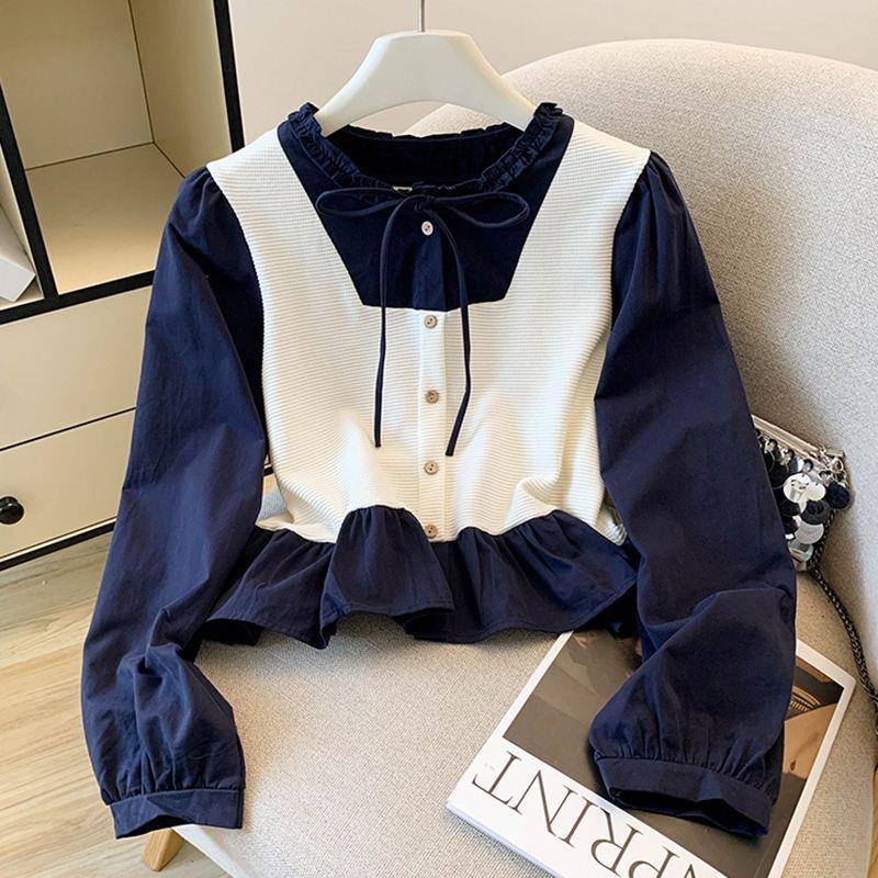 韩系撞色假两件拼接长袖衬衫女2025秋冬新款设计感荷叶边短款上衣