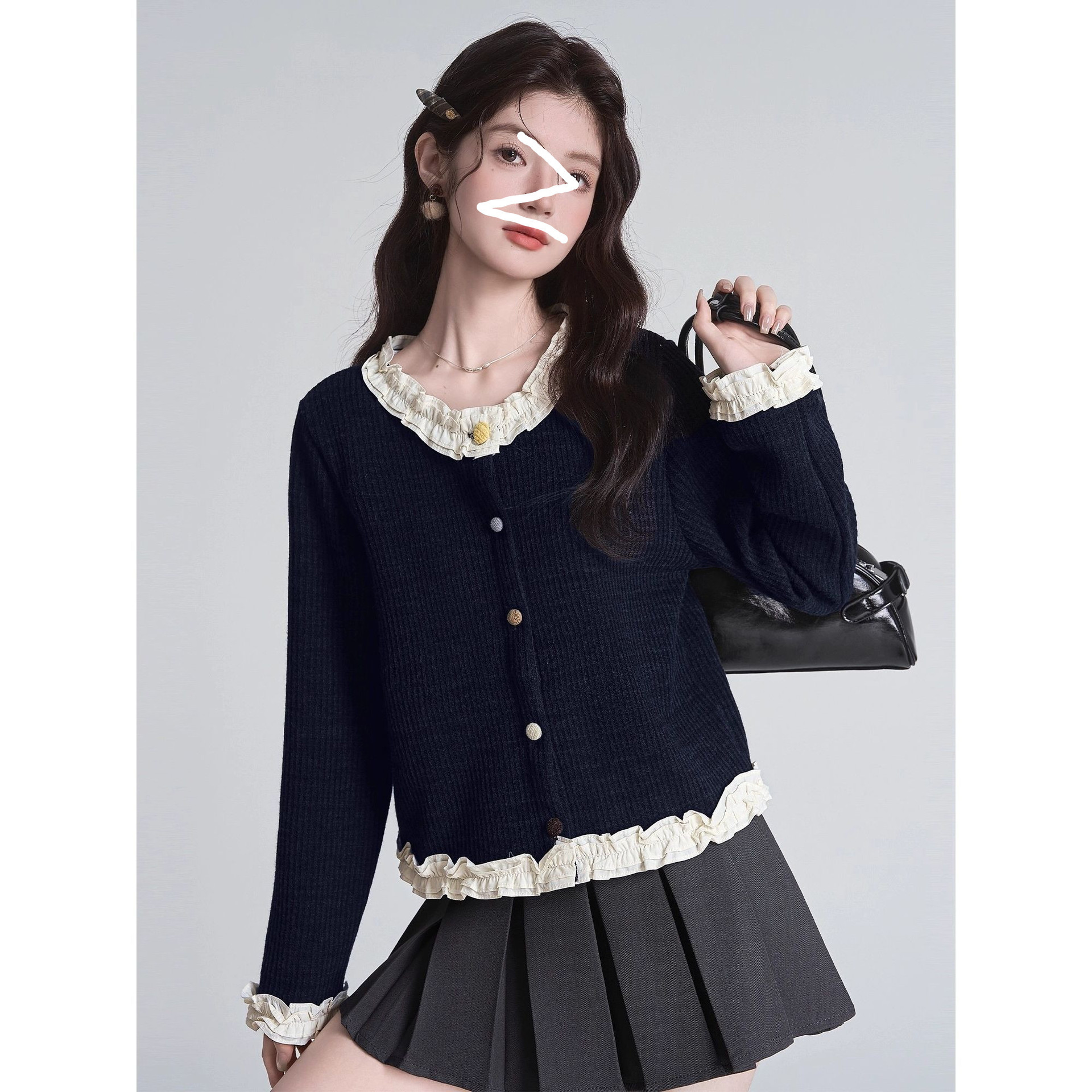 法式木耳边系带长袖衬衫女秋季高级感荷叶边娃娃衫撞色假两件上衣