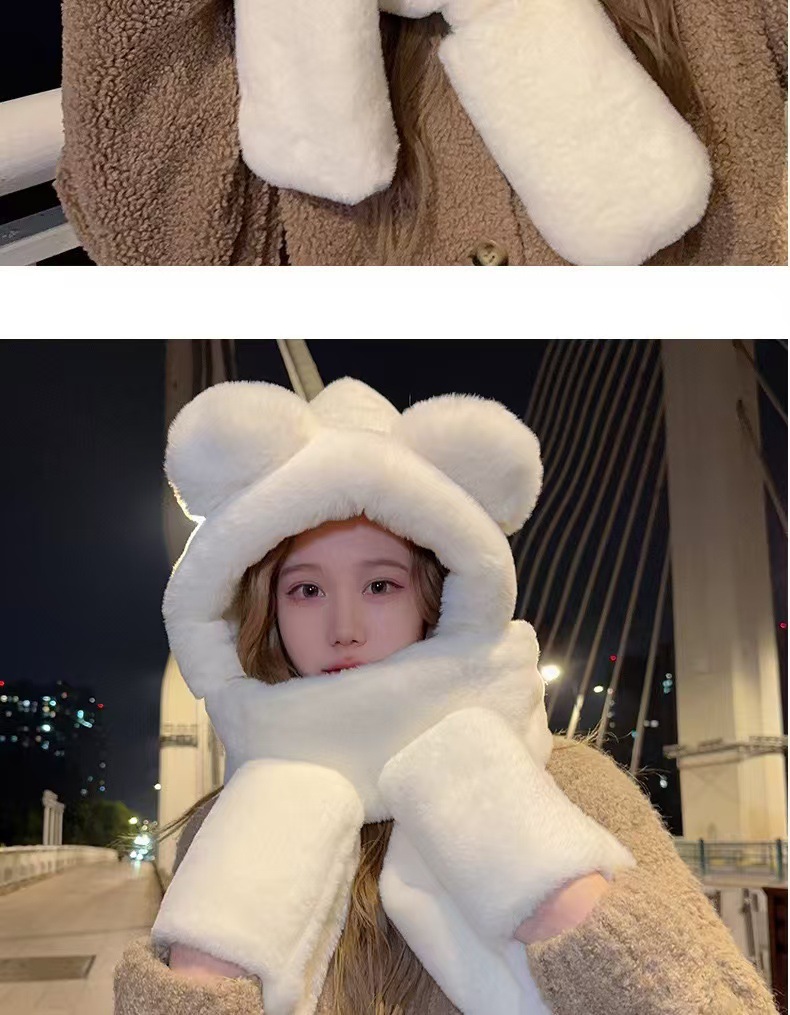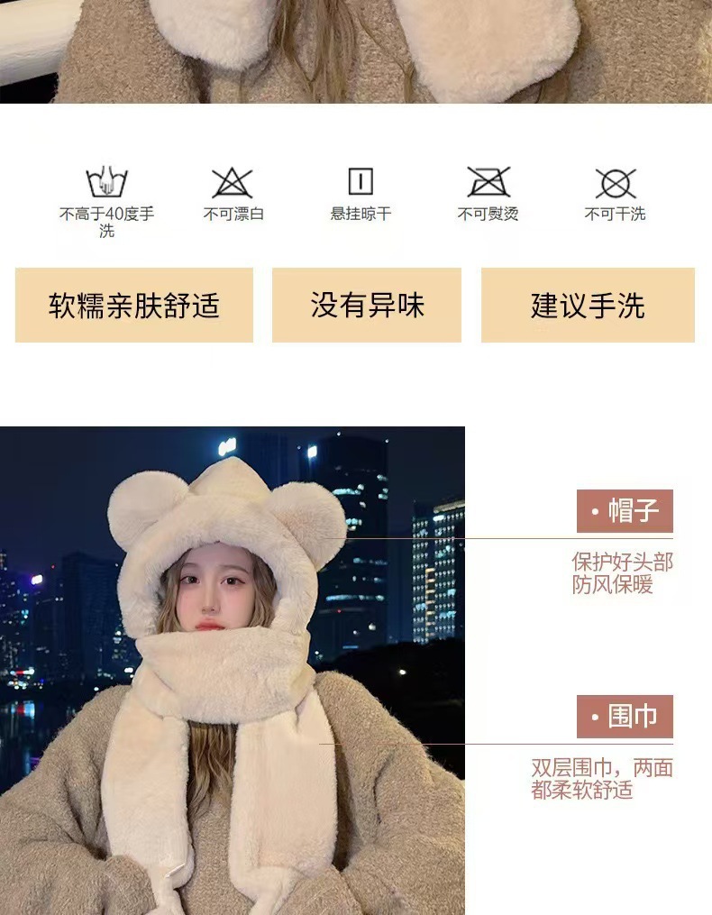 小熊围巾女冬季韩版百搭帽子围脖一体可爱护耳保暖连帽手套三件套