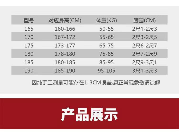 尺码 165码适合90-110斤,170码适合110-125斤,175码适合125-145斤,180码适合145-165斤,185码适合165-185斤,190码适合185-205斤