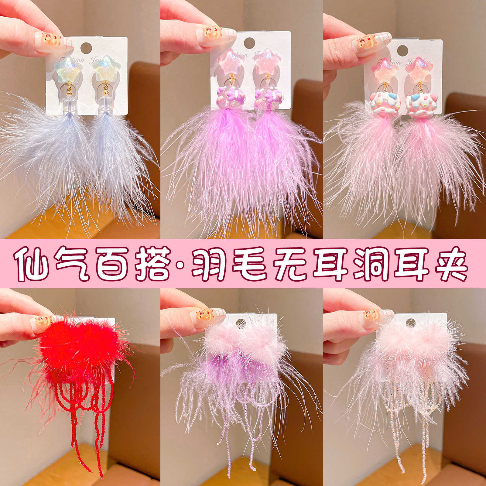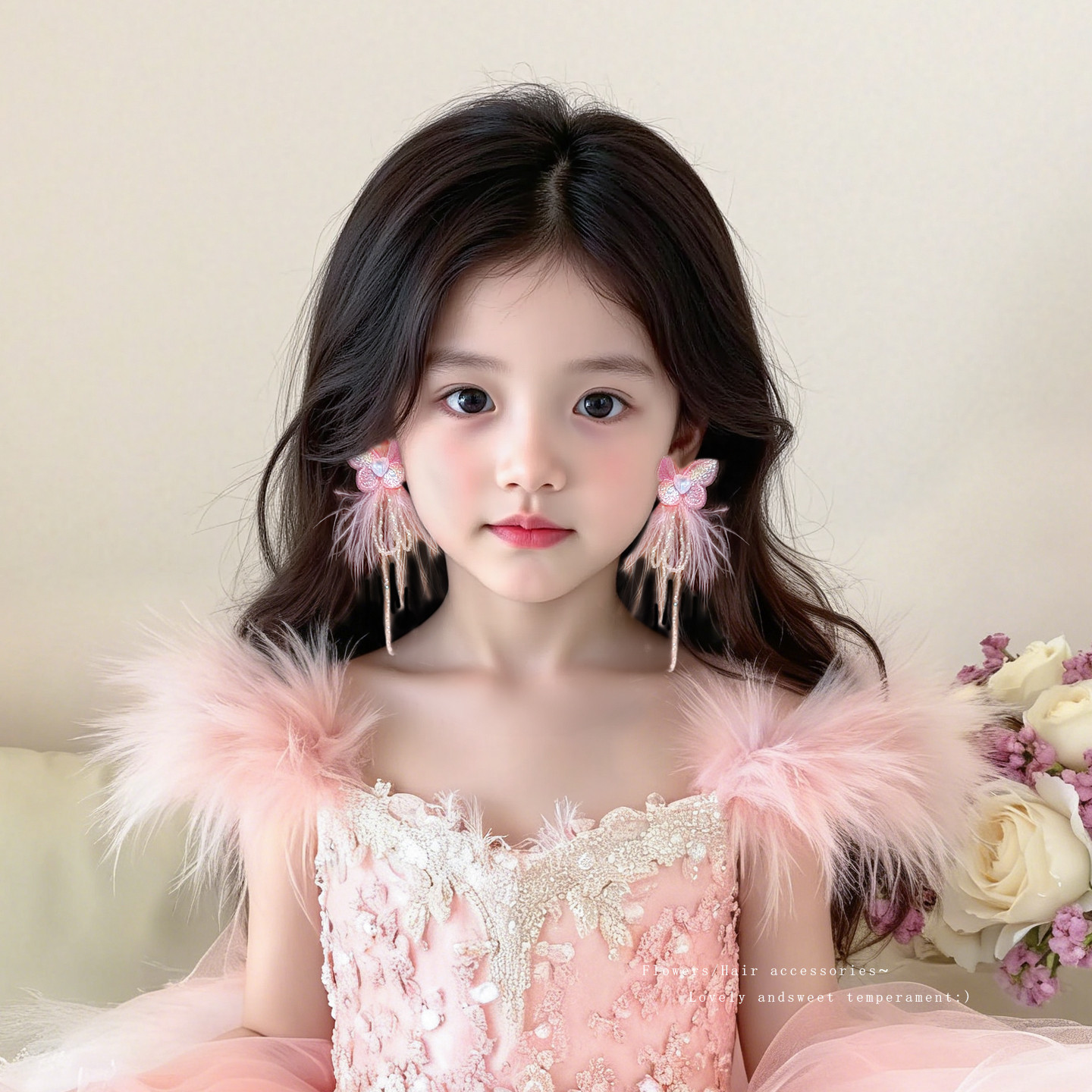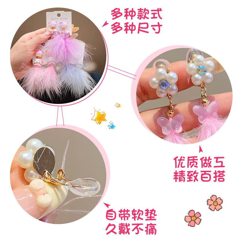 儿童羽毛耳夹仙气流苏花朵蝴蝶小女孩公主耳饰女童无痛耳环耳钉