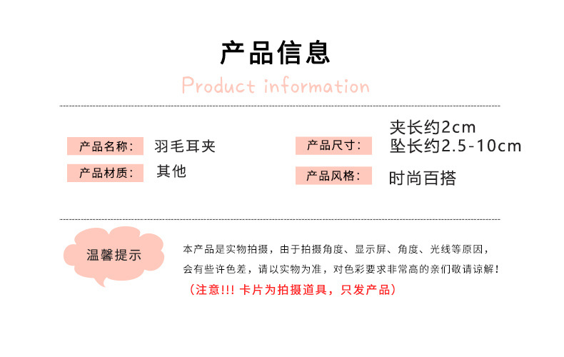 颜色 1#粉色星星羽毛耳夹1对装(坠长约9cm),2#蓝色星星羽毛耳夹1对装(坠长约9cm),3#紫色星星羽毛耳夹1对装(坠长约9cm),4#白色星星羽毛耳夹1对装(坠长约9cm),5粉色蝴蝶羽毛耳夹1对装(坠长约10cm),6#蓝色蝴蝶羽毛耳夹1对装(坠长约10cm),7#紫色蝴蝶羽毛耳夹1对装(坠长约10cm),8#花朵蜜桃羽毛耳夹1对装(坠长约6cm),9#花朵柿子羽毛耳夹1对装(坠长约9cm),10#樱花桃子羽毛耳夹1对装(坠长约7cm),11#樱花蜜桃羽毛耳夹1对装(坠长约7cm),14#毛球珠串羽毛耳夹1对装(坠长约10.5cm),15#毛球流苏耳夹1对装(坠长约7cm),16#樱花流苏耳夹1对装(坠长约2.5cm)