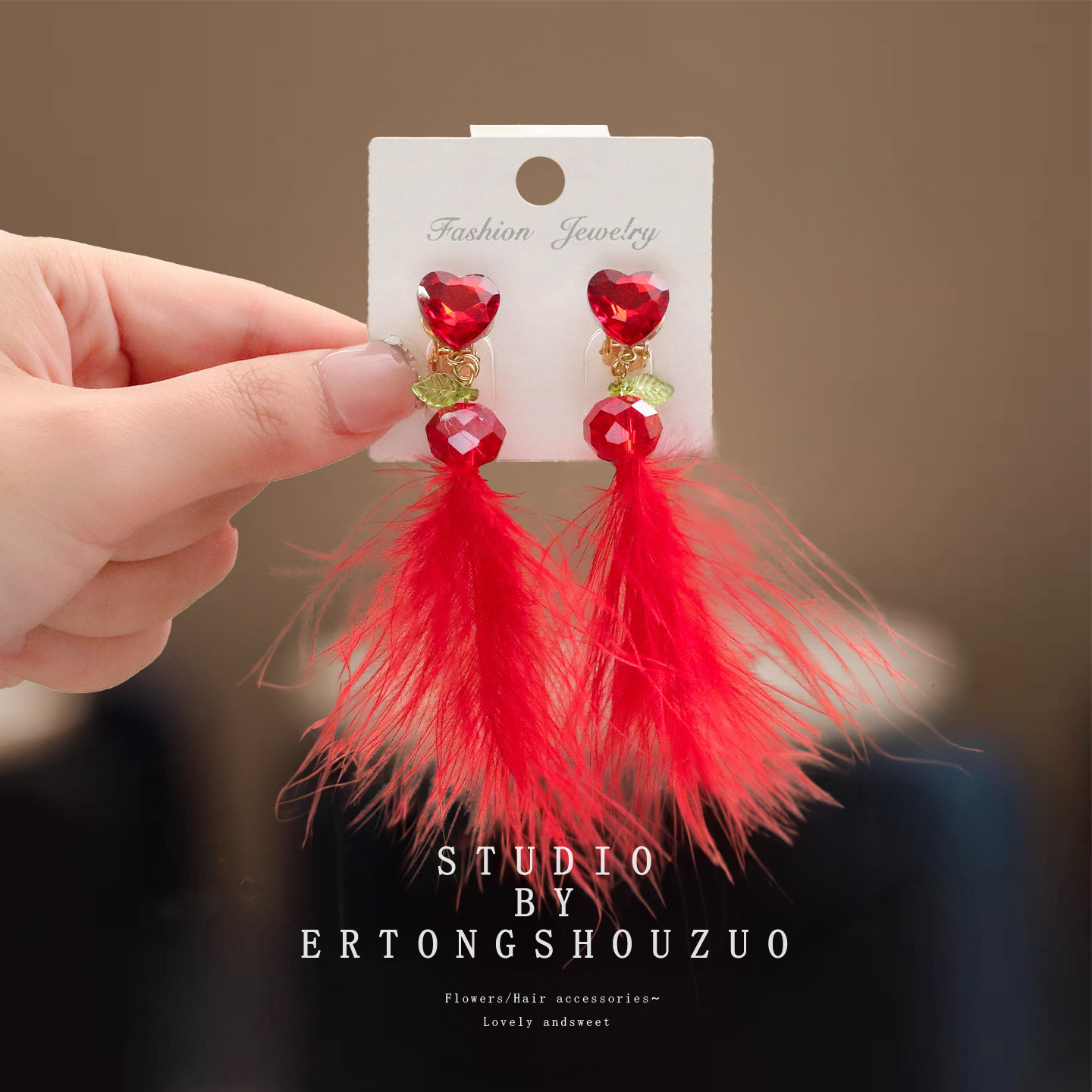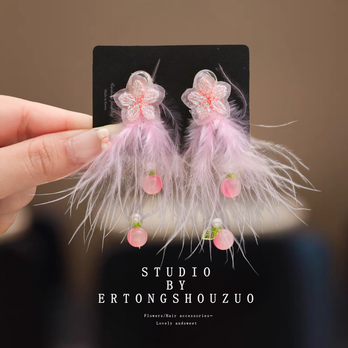 儿童硅胶无痛耳夹中国风红色花朵樱桃无耳洞耳环灵动羽毛耳坠首饰