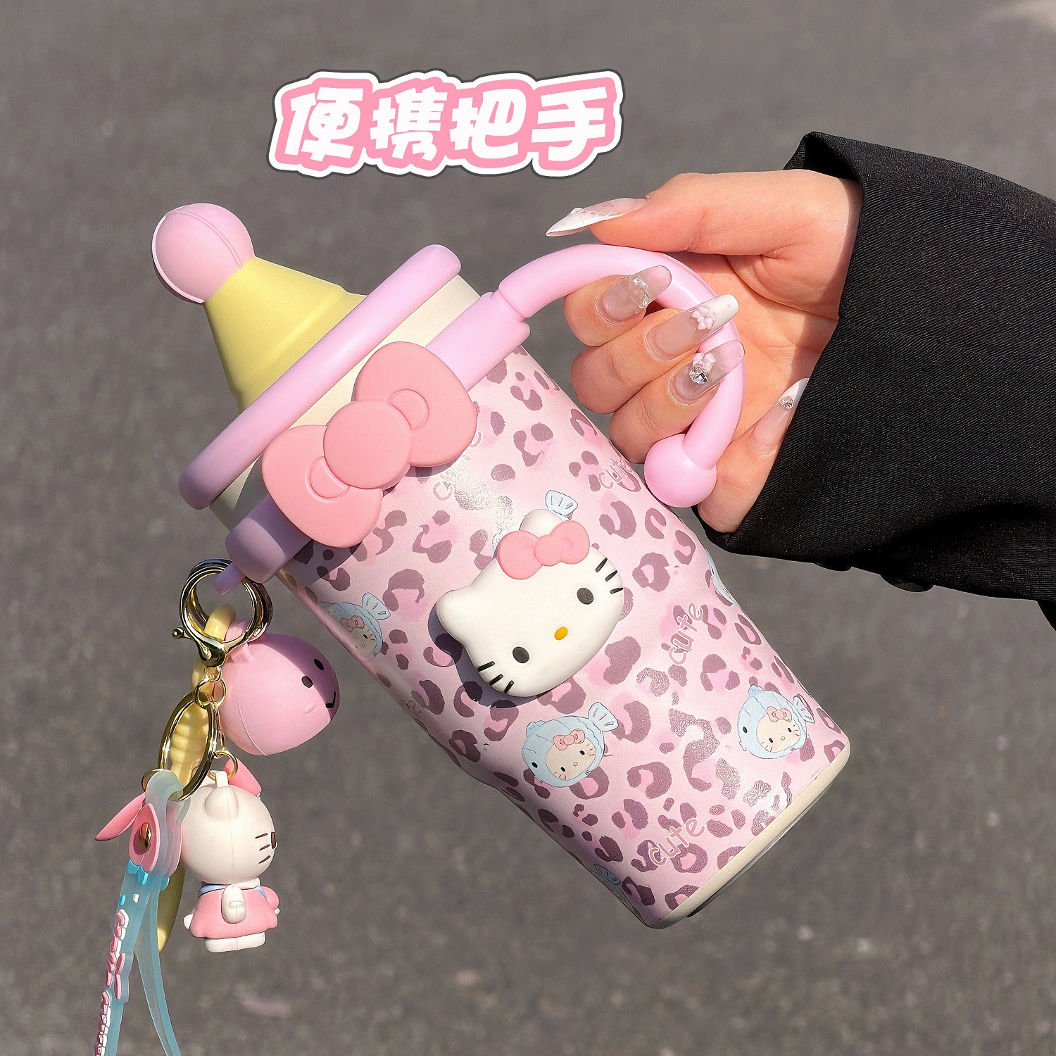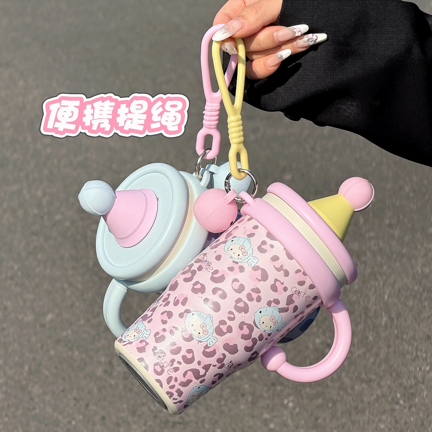 水杯KT猫保温杯女生新款高颜值豹纹咖啡杯办公室桌面带把手吸管杯