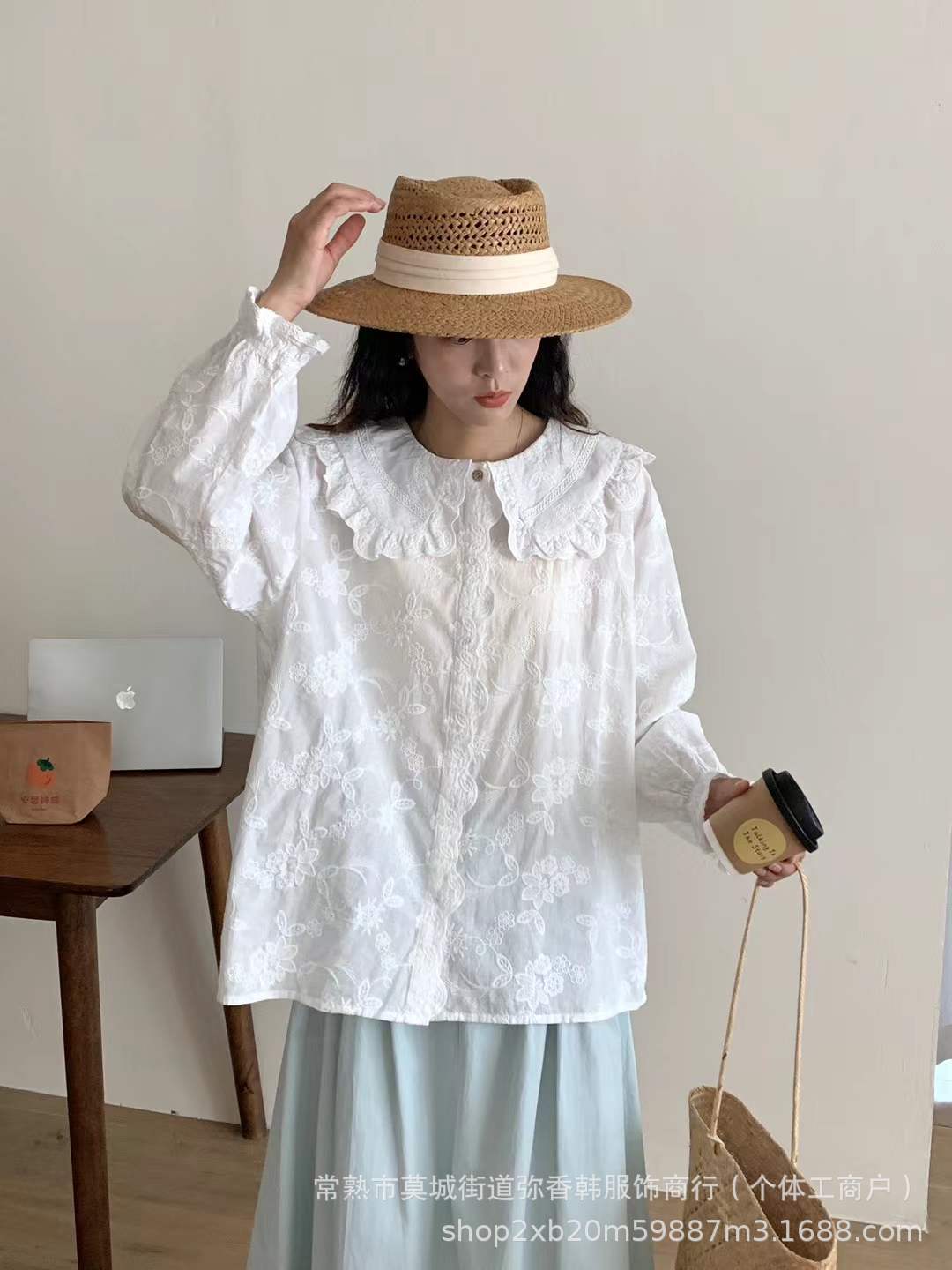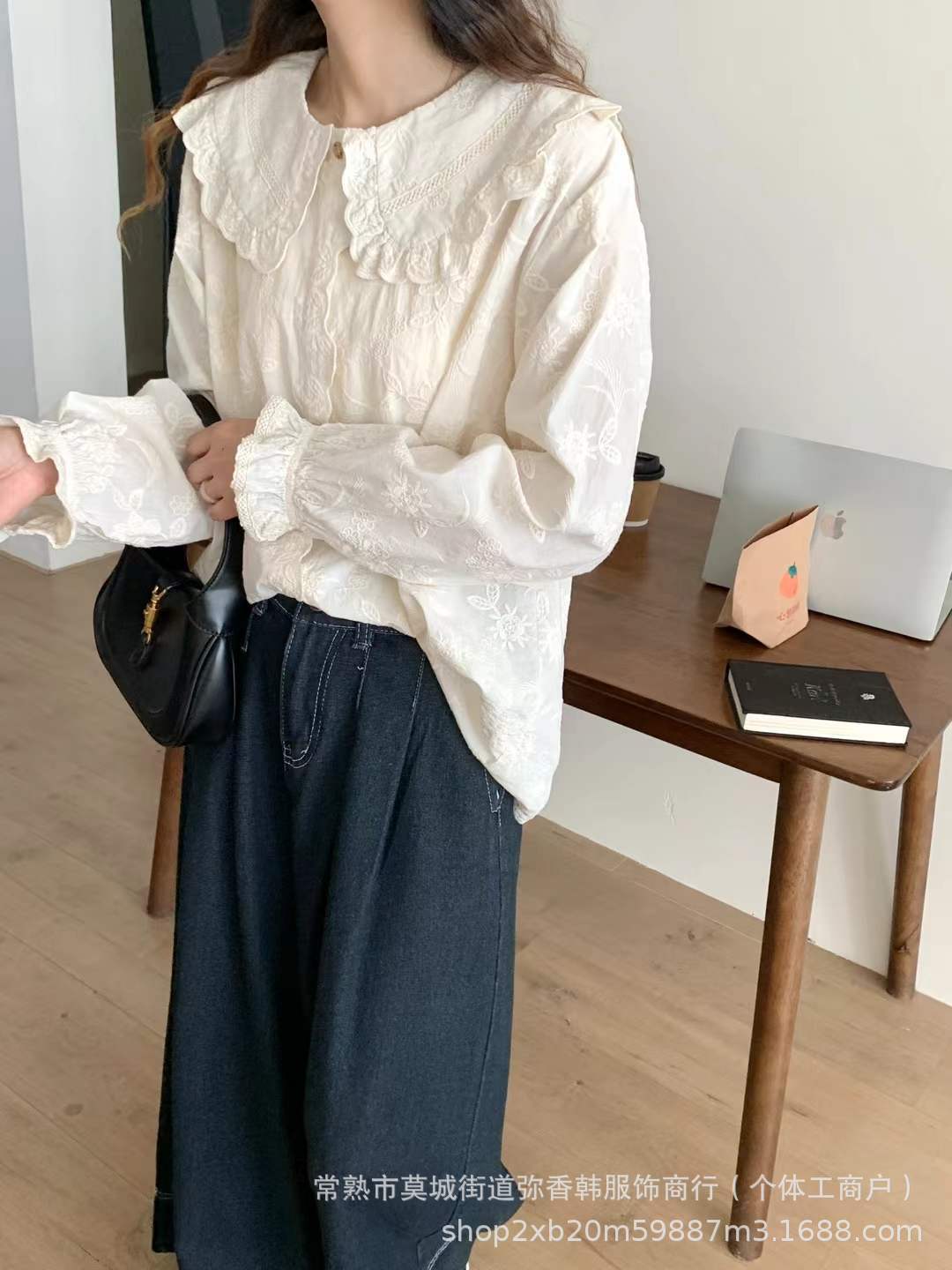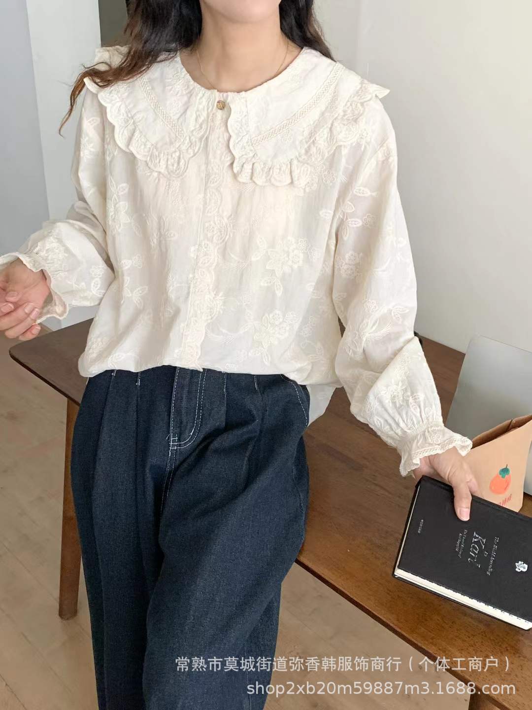 825350娃娃领衬衫女秋冬季新款日系文艺刺绣提花上衣