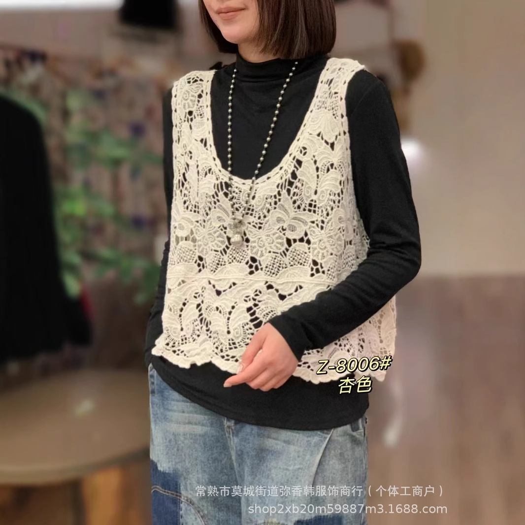 8006透かし編みの文芸のガーターの馬甲の復古の新型の外はベストのゆったりしている袖なしの短いブラウスの上着を着ます。