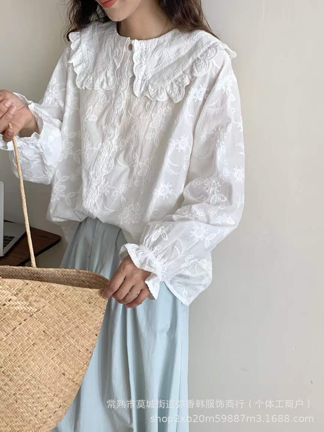 韩版重工荷叶边蕾丝娃娃领棉衬衫女长袖百搭刺绣打底衫