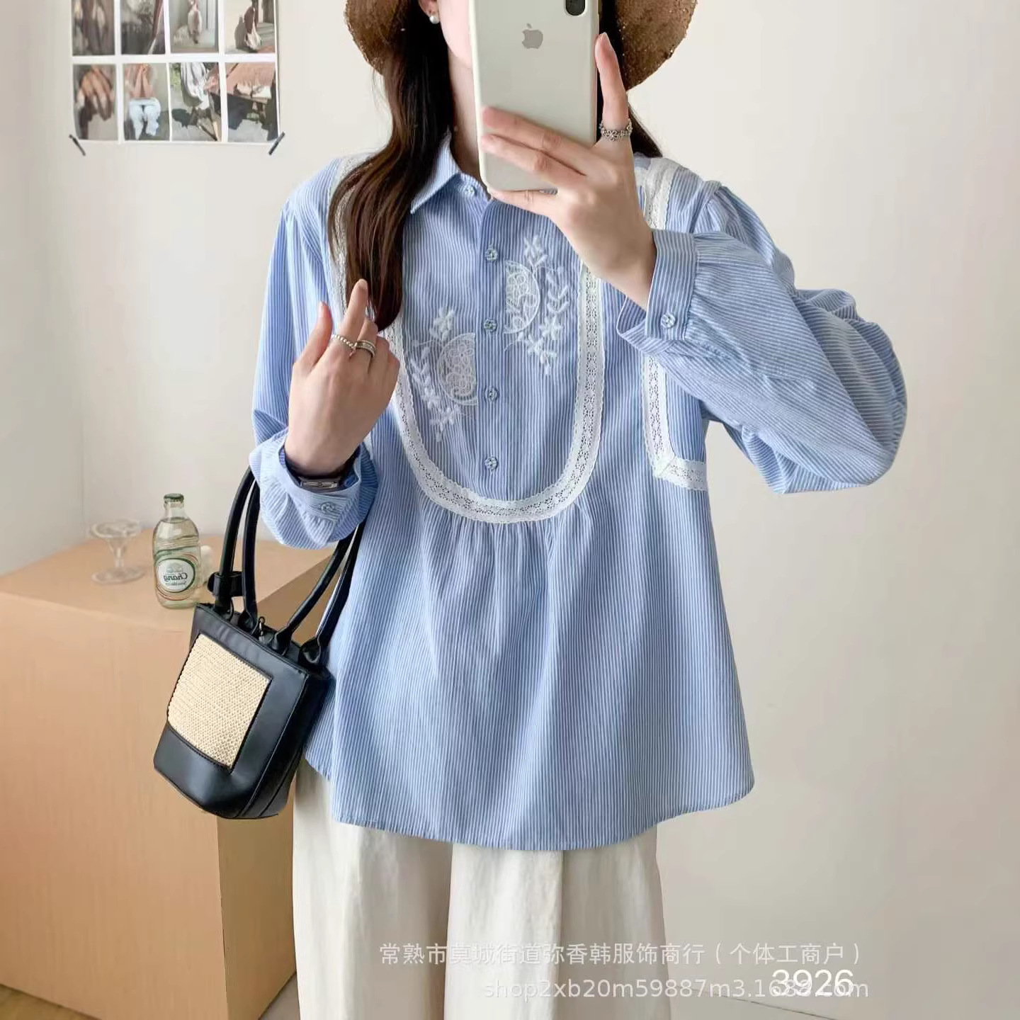 3926半门襟竖条纹镂空刺绣棉衬衫