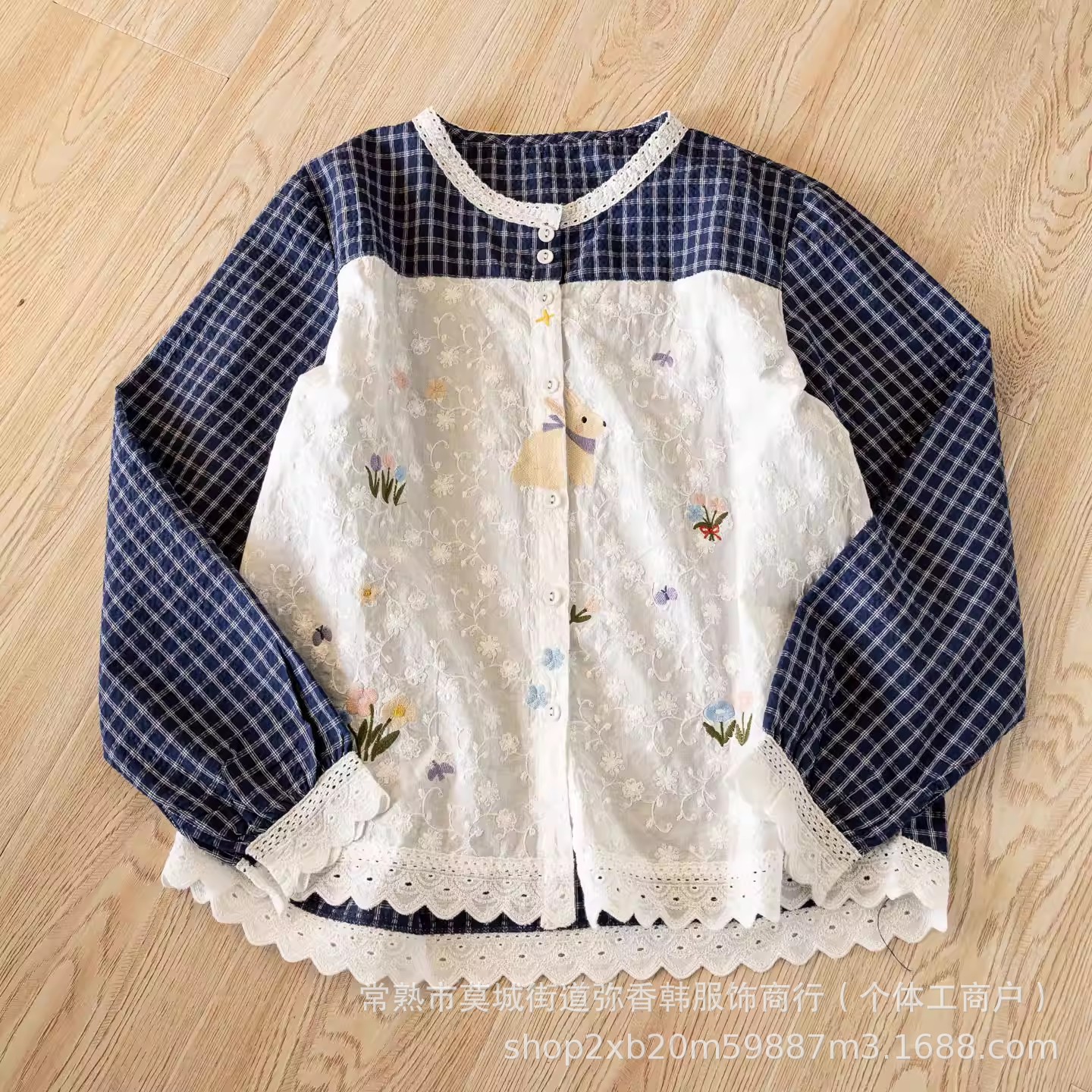 春日森系田园风小兔子刺绣格纹拼接长袖衬衫女蕾丝领棉衬衫