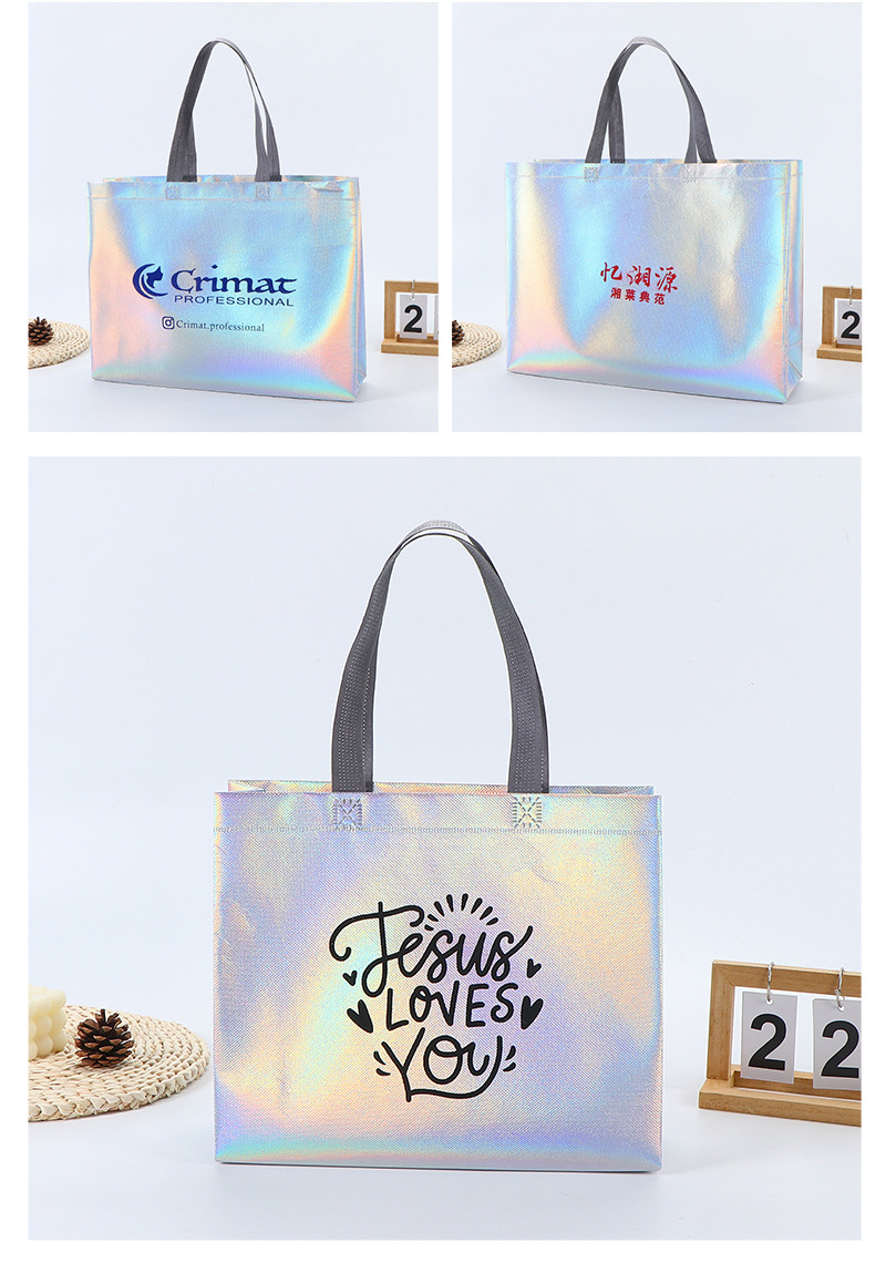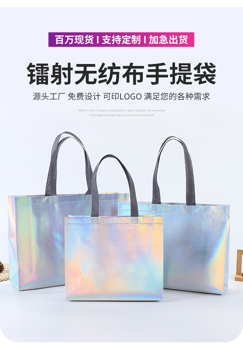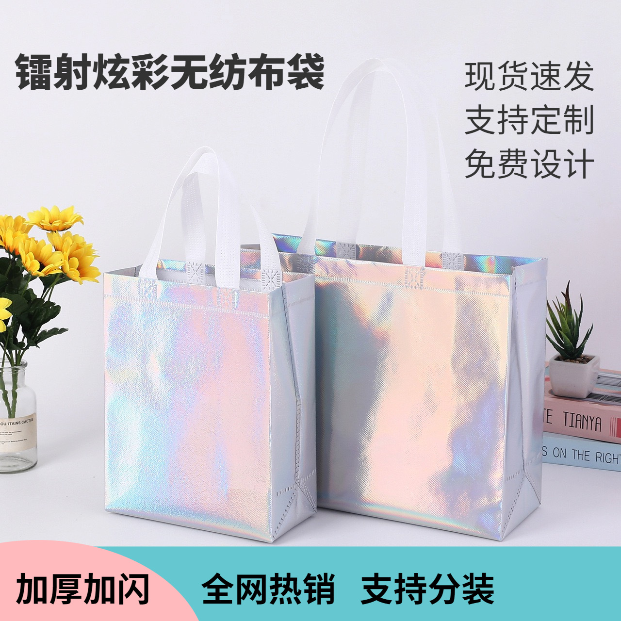 网红跨境炫彩镭射袋现货黑色手提无纺布袋子覆膜外贸购物定做logo