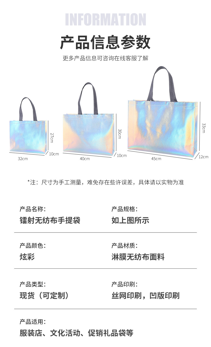 规格型号 炫彩镭射;小号:长32高27侧10,炫彩镭射;中号:长40高30侧10,炫彩镭射;大号:长45高33侧12,无纺布袋;按需