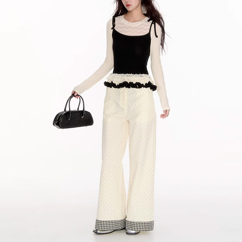 25/SSデザイン偽2枚レースストラップニット波点ズボン2枚セット韓国系甘い春服