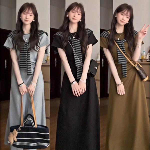 女性用韓国風ドレススーツ、夏用半袖ラウンドネックスカート、ファッショナブルでスリムなレイジースタイルストライプショールロングスカート