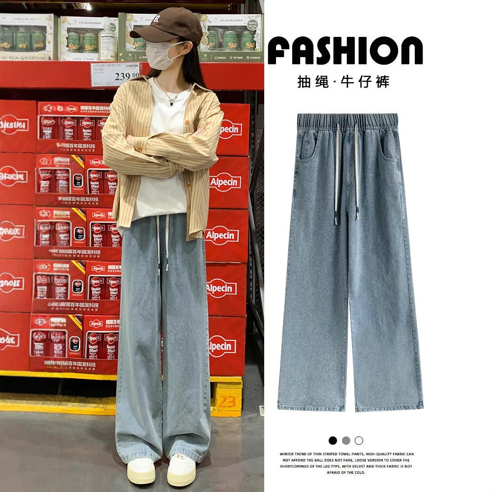 青いシルクのジーパンの女性の夏の2025新型の高い腰の垂れ下がった感じの怠惰でゆったりしているまっすぐな筒はやせている広腿のズボンを現します。