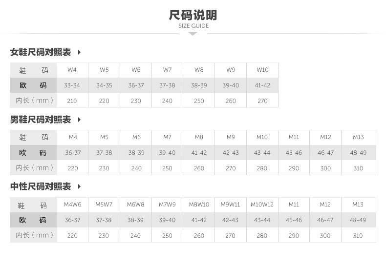 尺码 M4/W6(适合36的脚),M5/W7(适合37的脚),M6/W8(适合38的脚),M7/W9(适合39-40的脚),M8/W10(适合41的脚),M9/W11(适合42-43的脚),M10/W12(适合44的脚),M11/W13(适合45的脚)
