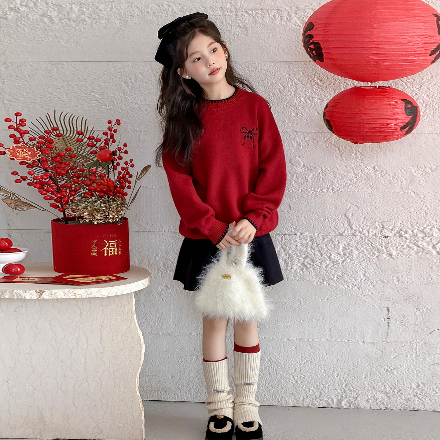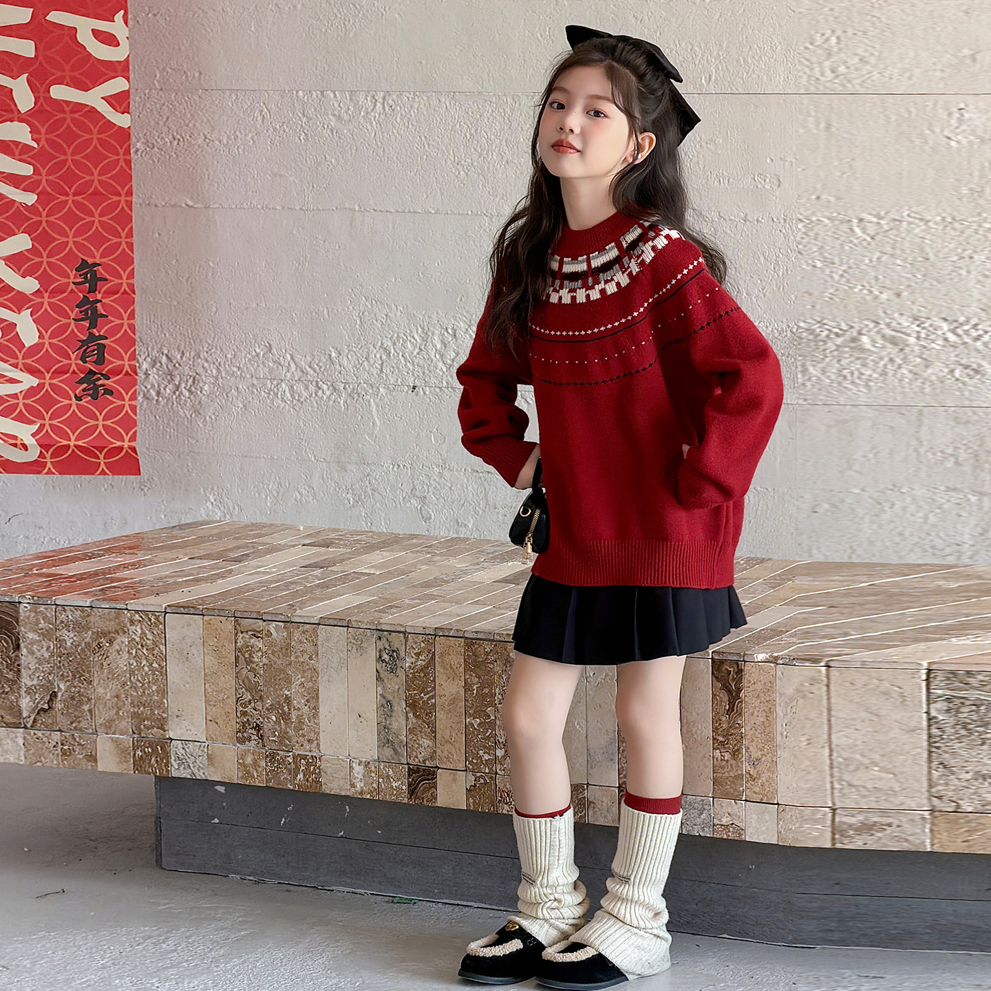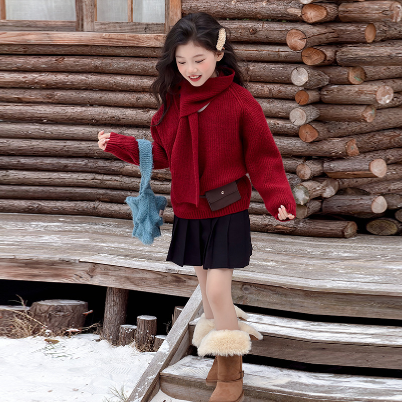 女童洋气红色新年款毛衣2025秋冬新款大童韩版加厚保暖针织毛线衣