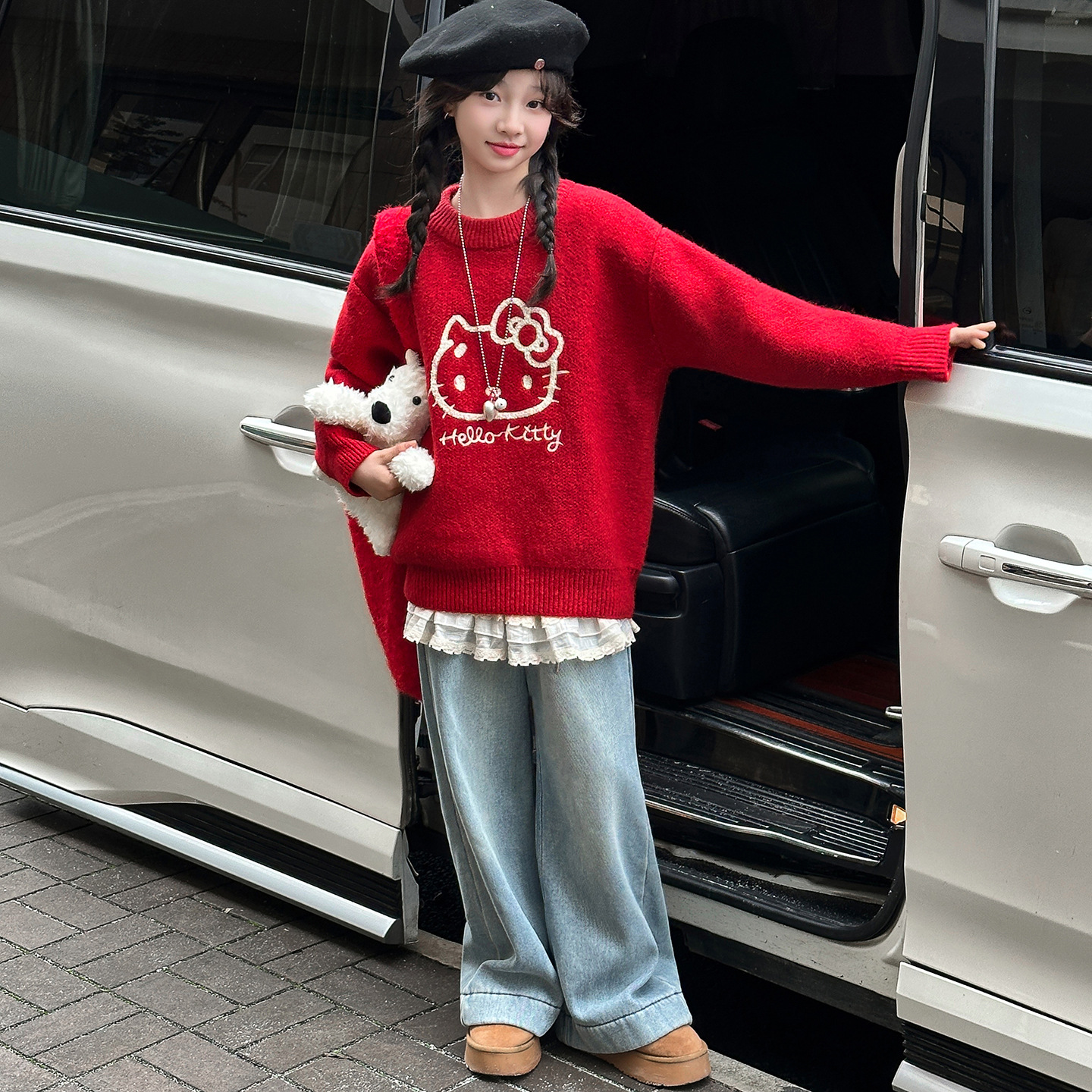 女童卡通KT猫毛衣2025秋冬新款大童年货款加厚新年红色毛线衣上衣