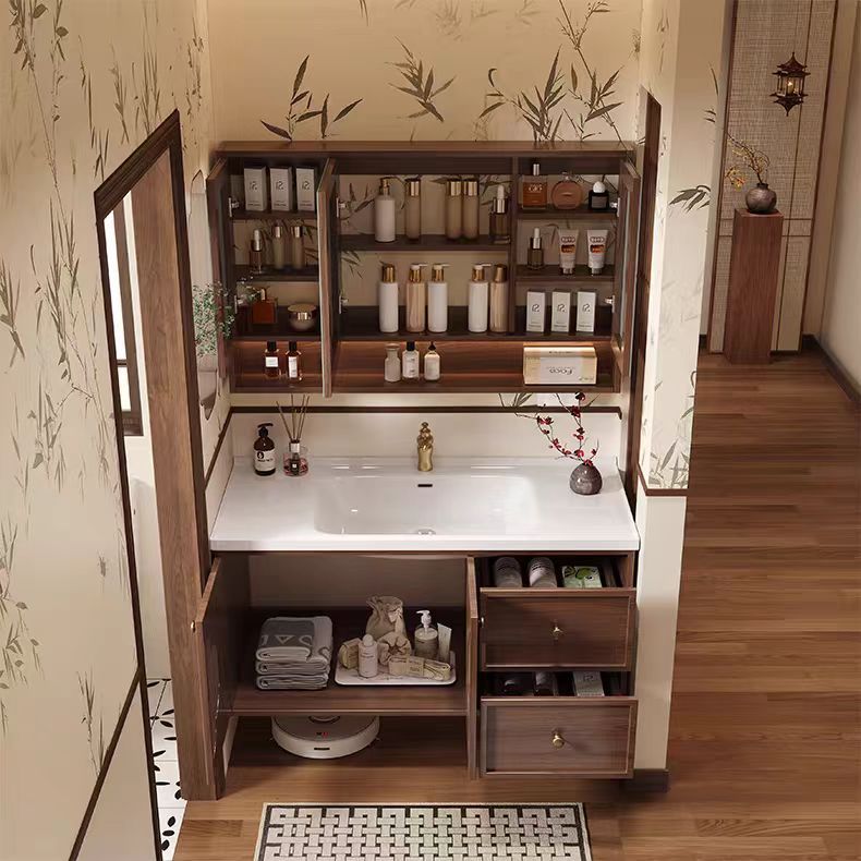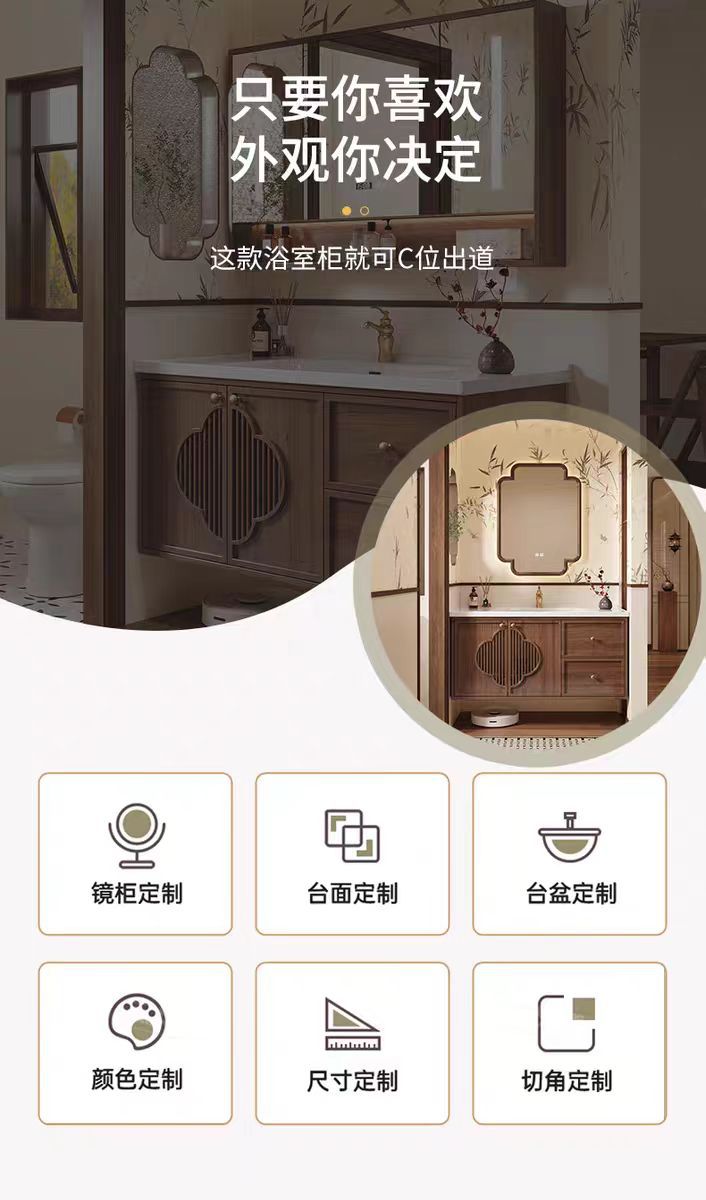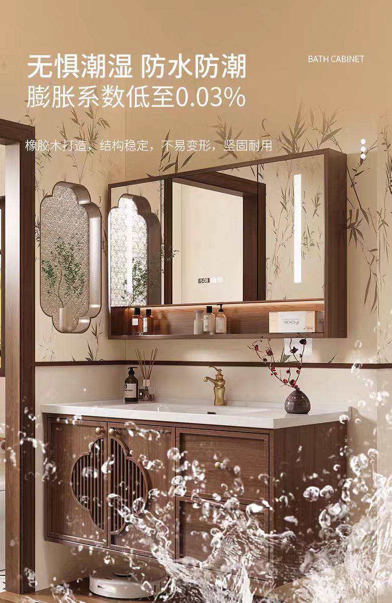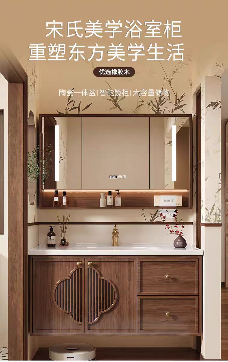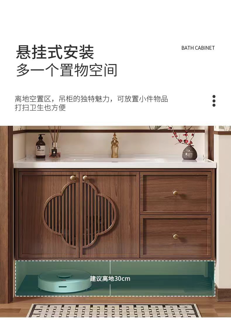 新中国式古風陶磁器一体盆浴室キャビネット床掃除ロボット折り畳み風水鏡洗面台胡桃木色