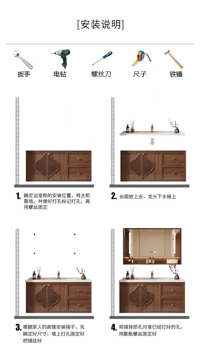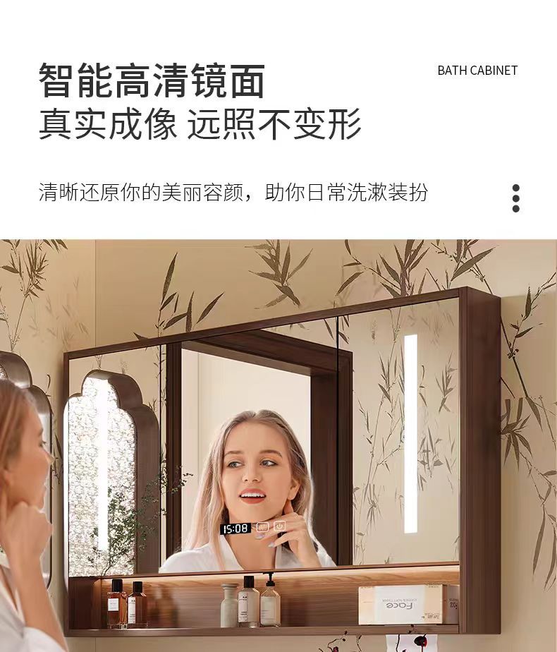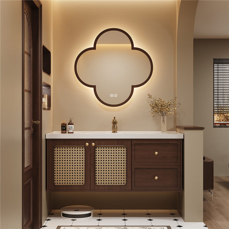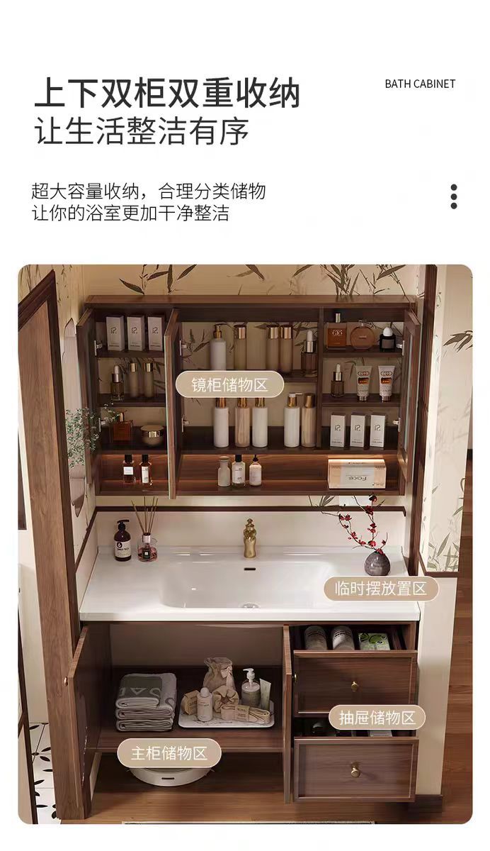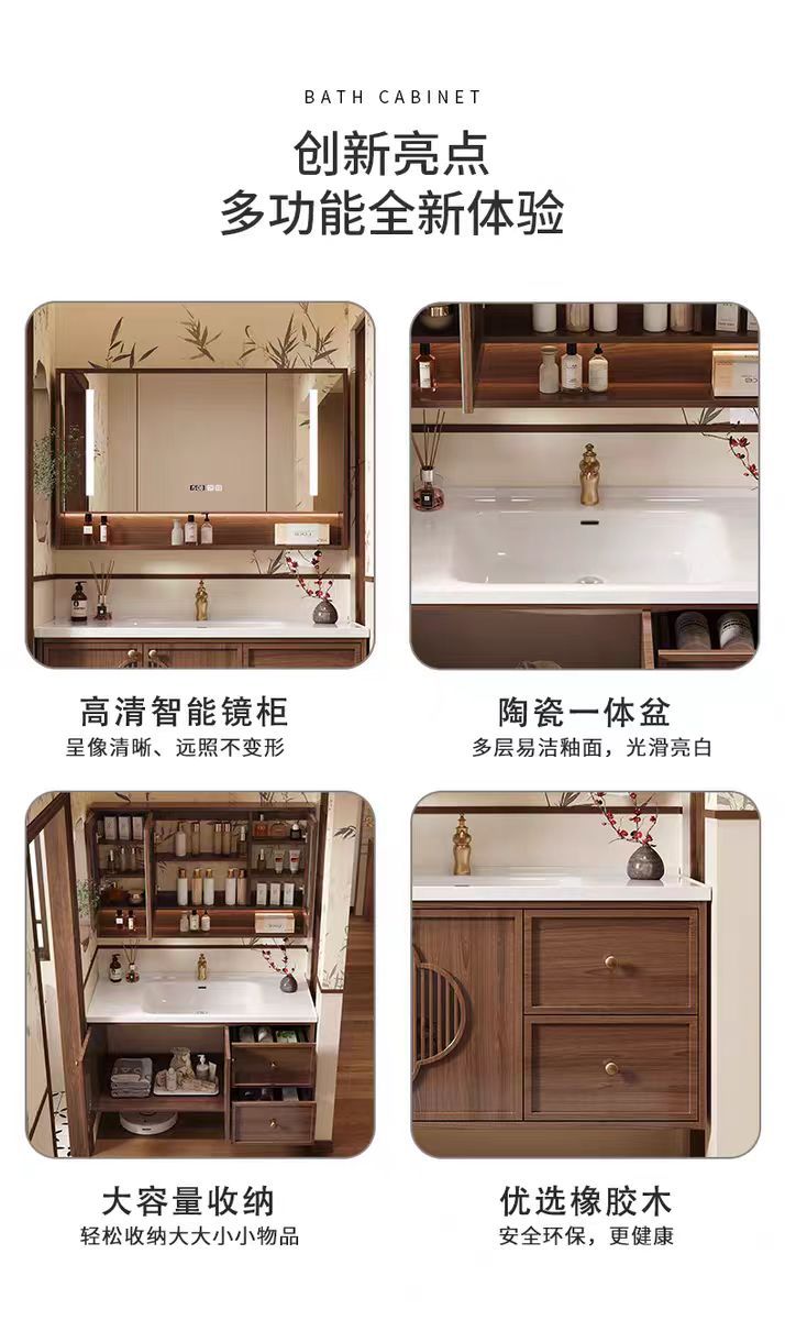 新中国式古風陶磁器一体盆浴室キャビネット床掃除ロボット折り畳み風水鏡洗面台胡桃木色