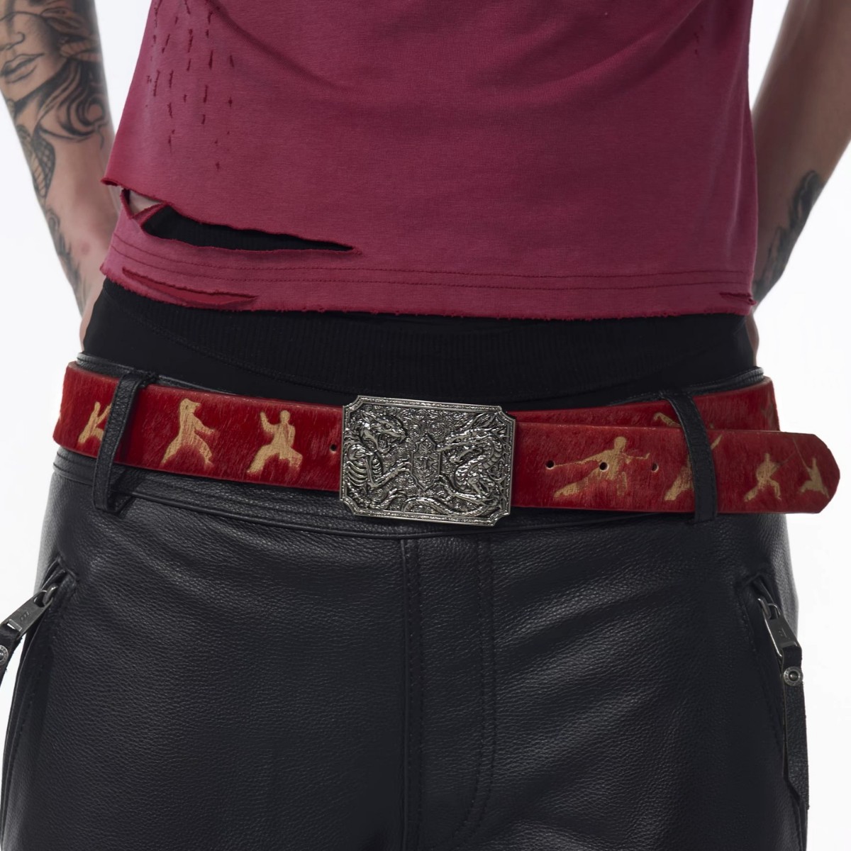 武术烧花小人 腰带男激光雕刻双龙金属扣头皮带个性复古装饰腰封