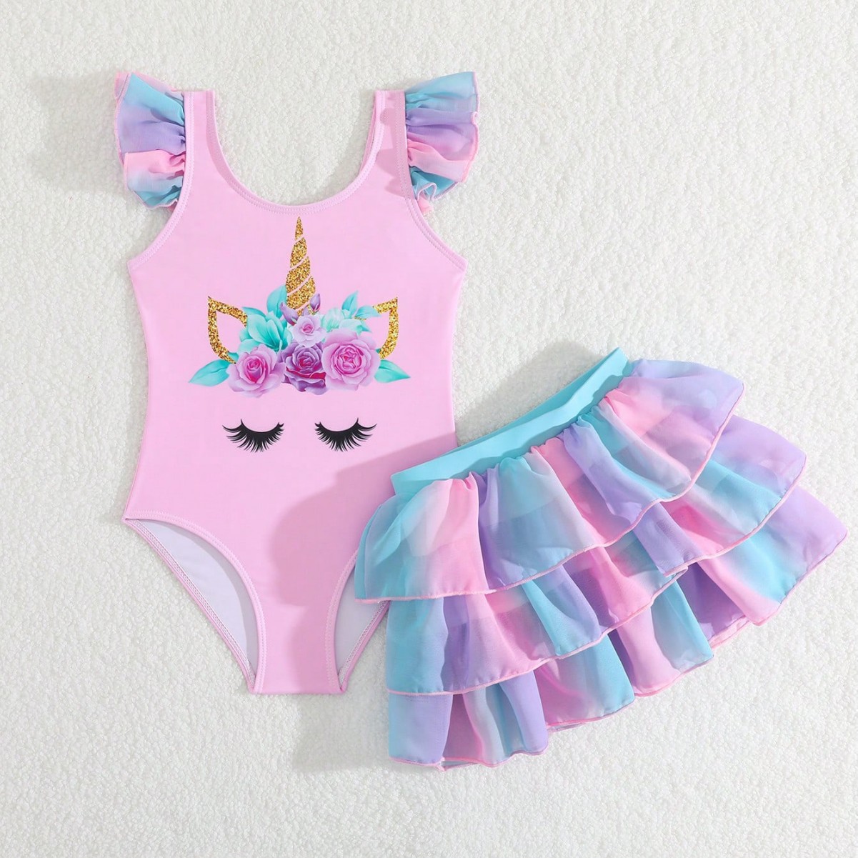 新しいクロスボーダーヨーロッパとアメリカの女の子ユニコーン絞り染めワンピース漫画水着アマゾンベストセラースカート付き女の子ツーピース