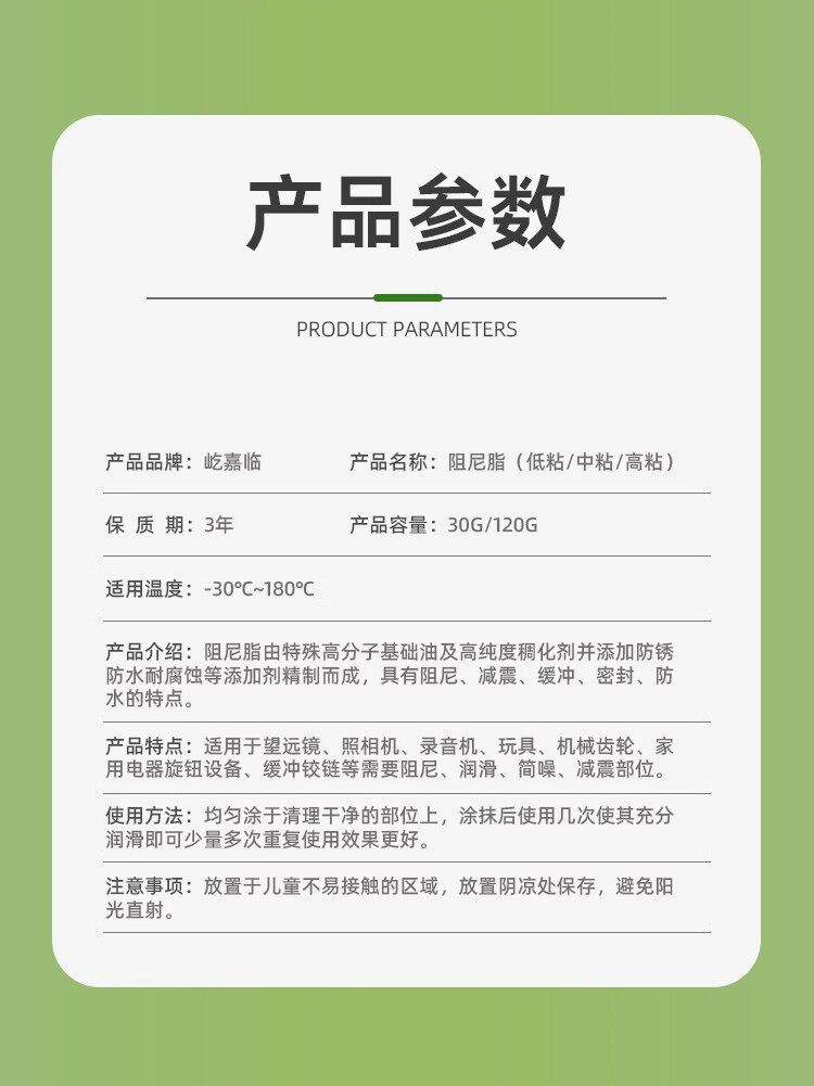 规格 【低粘】食品级阻尼脂-30克,【中粘】食品级阻尼脂-30克,【高粘】食品级阻尼脂-30克,【低粘】食品级阻尼脂-120克,【中粘】食品级阻尼脂-120克,【高粘】食品级阻尼脂-120克