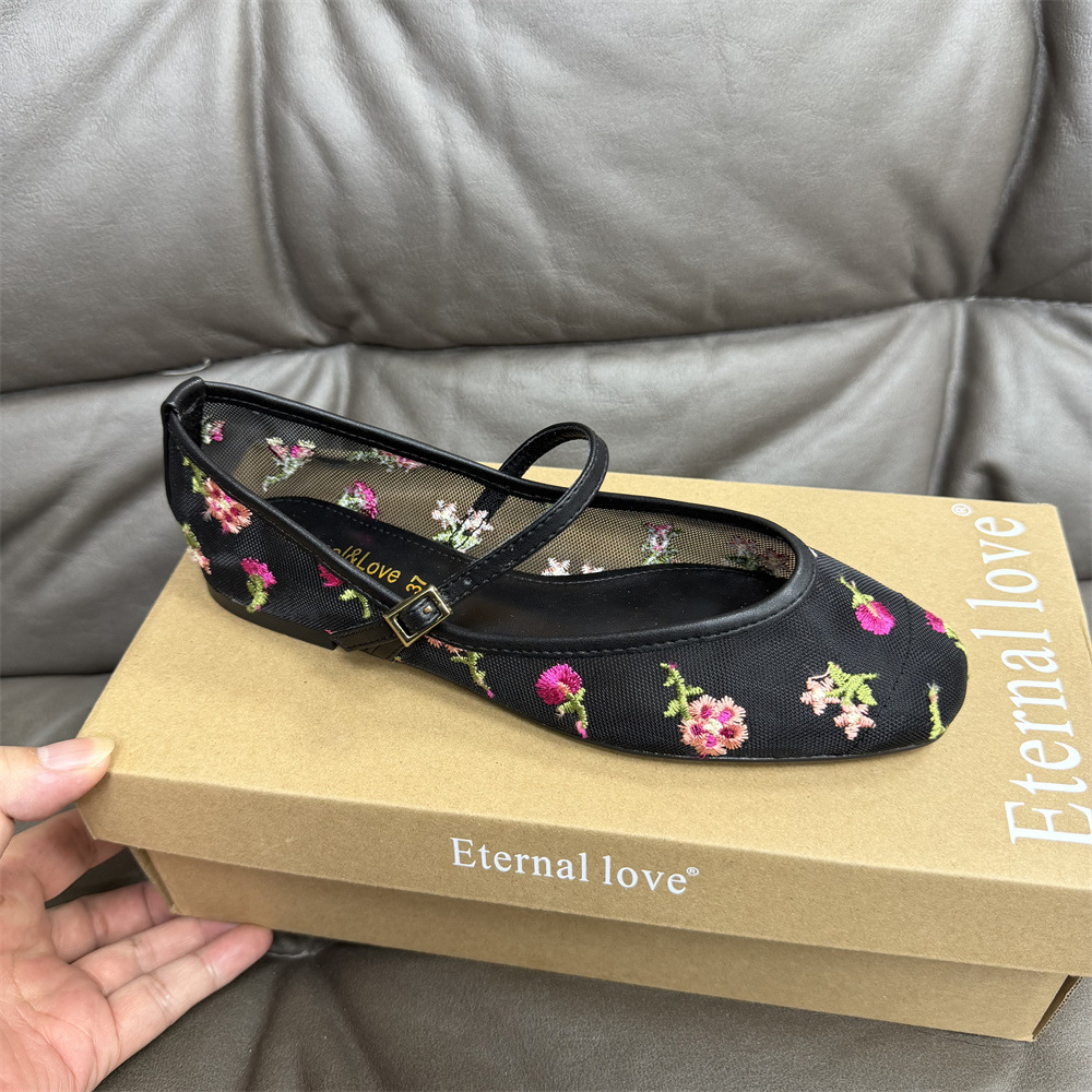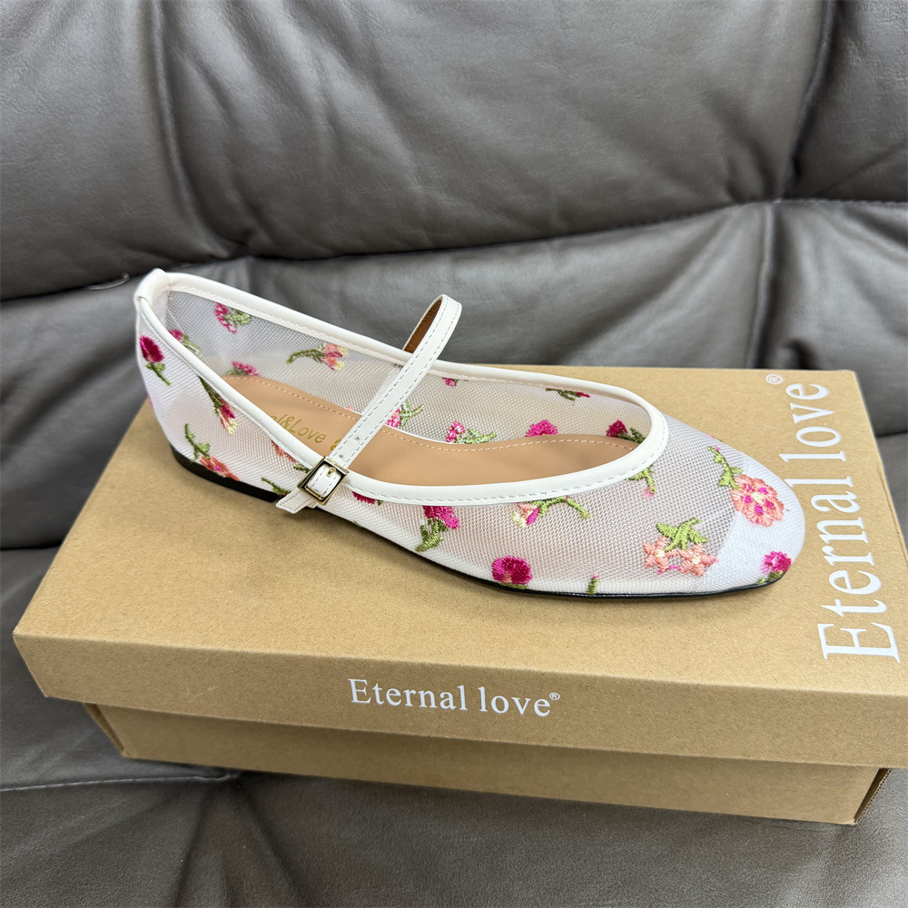 ZAスペイン製ラウンドトゥメッシュグリーンフラワー刺繍メッシュ生地バレエシューズレディースフラットシューズ欧米風