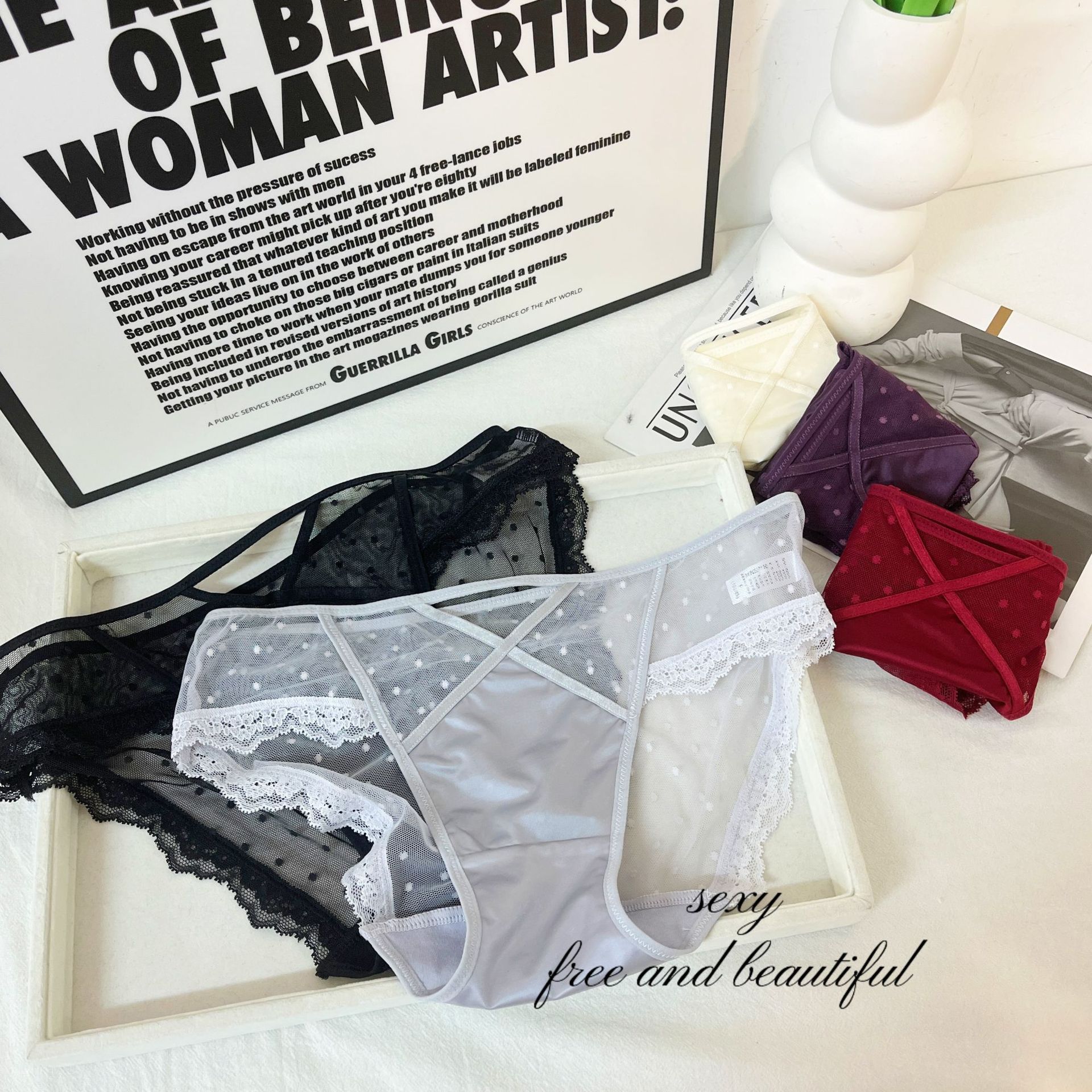 レース付きセクシーパンティー、純綿クロッチ、女性用エロティックローウエストガールズスタイル三角パンツ、肌に優しいネット素材