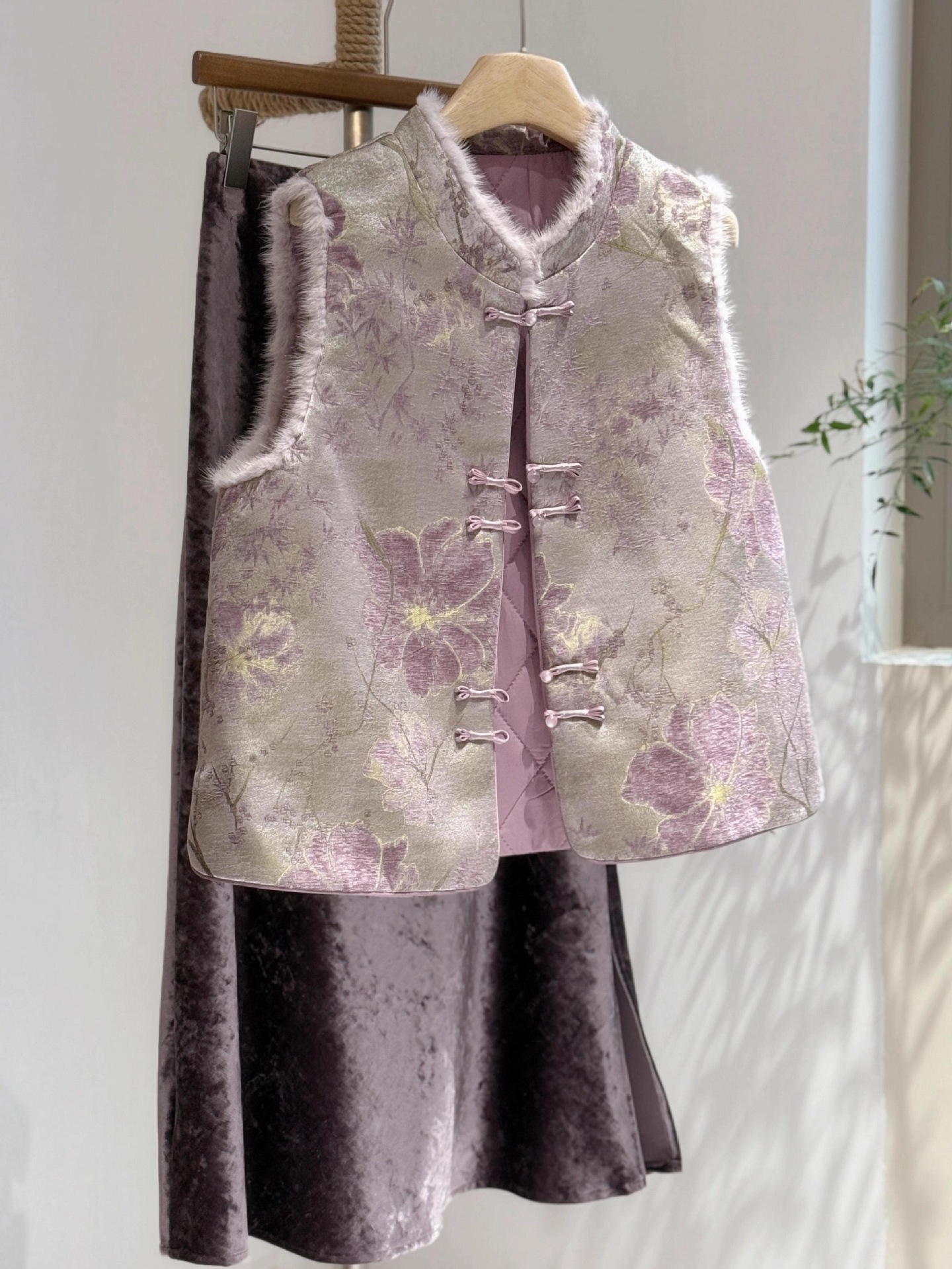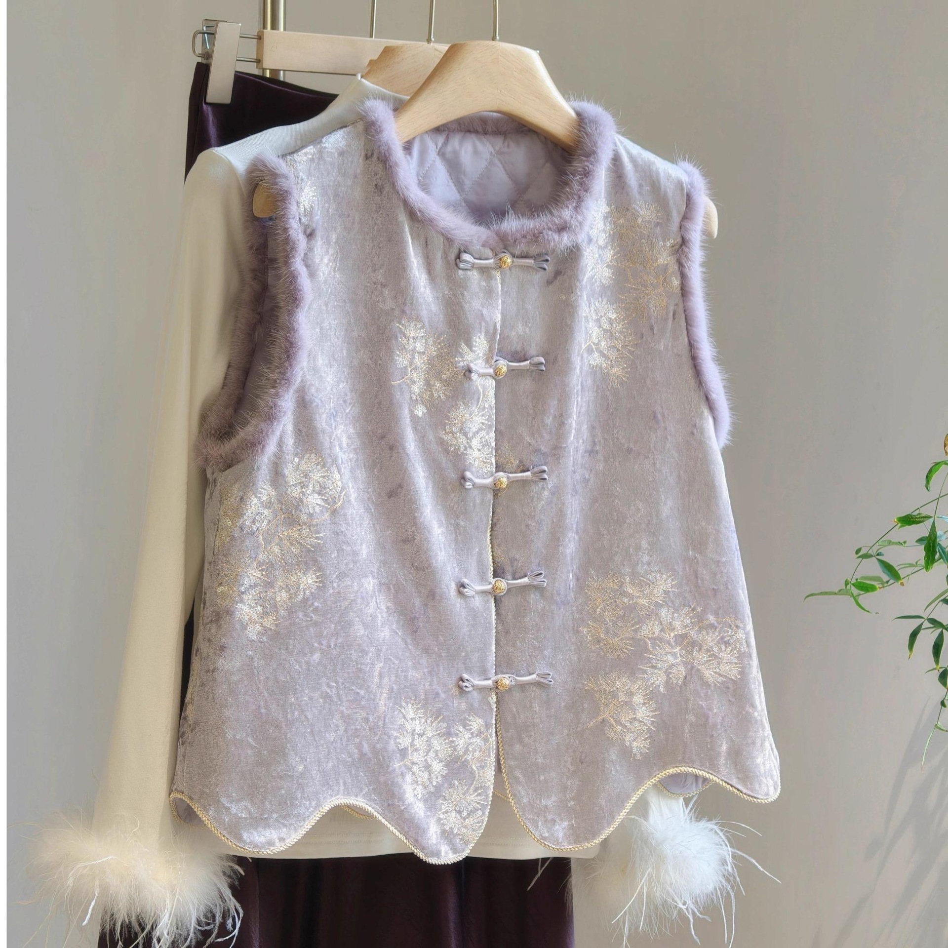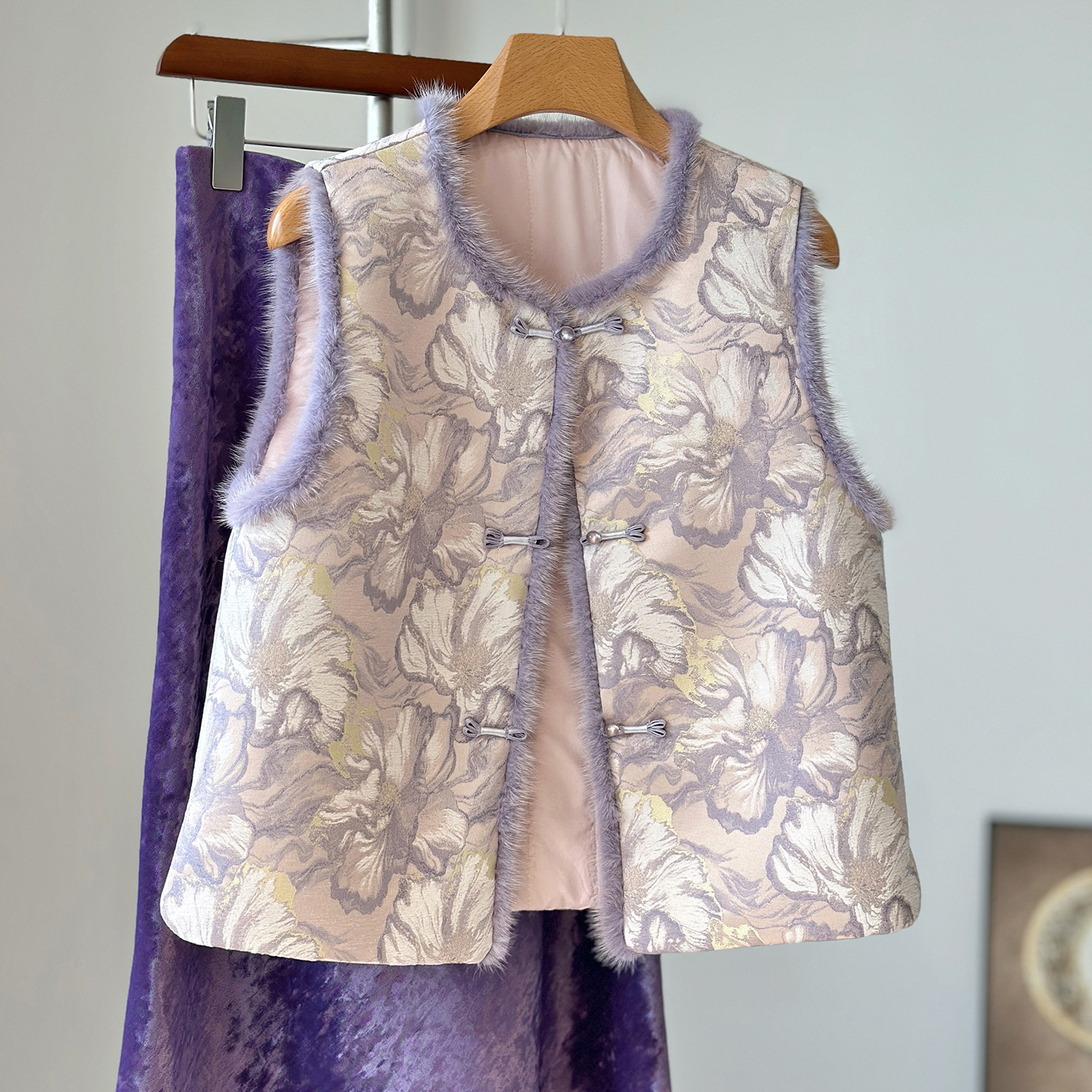 洋气减龄紫色新中式时尚马甲显白高端毛毛国风夹棉盘扣马夹背心