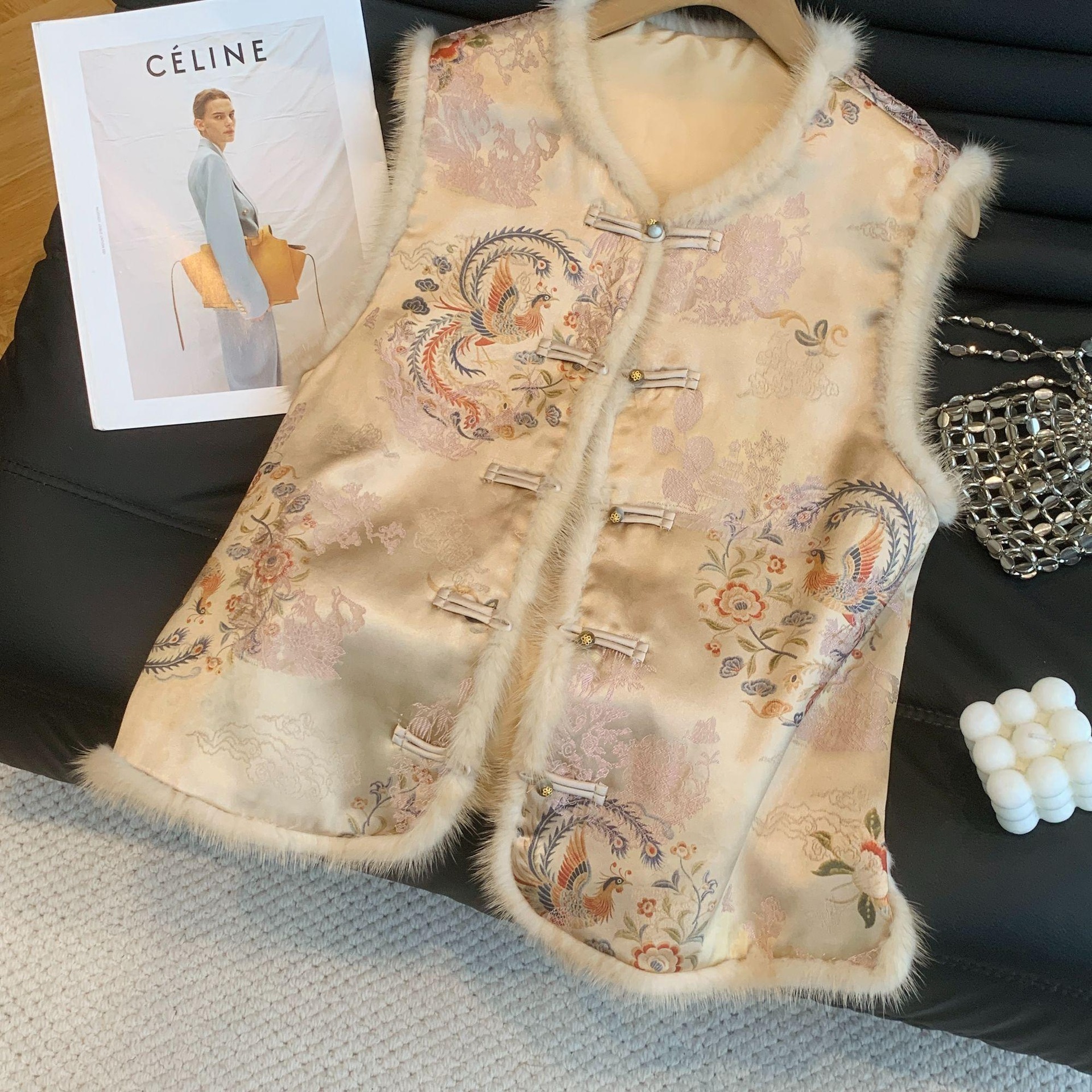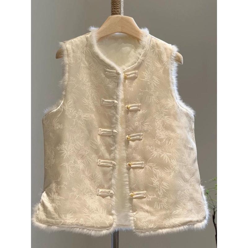 国风夹棉马甲秋冬提花盘扣坎肩背心女减龄马夹拼接毛毛新中式外套