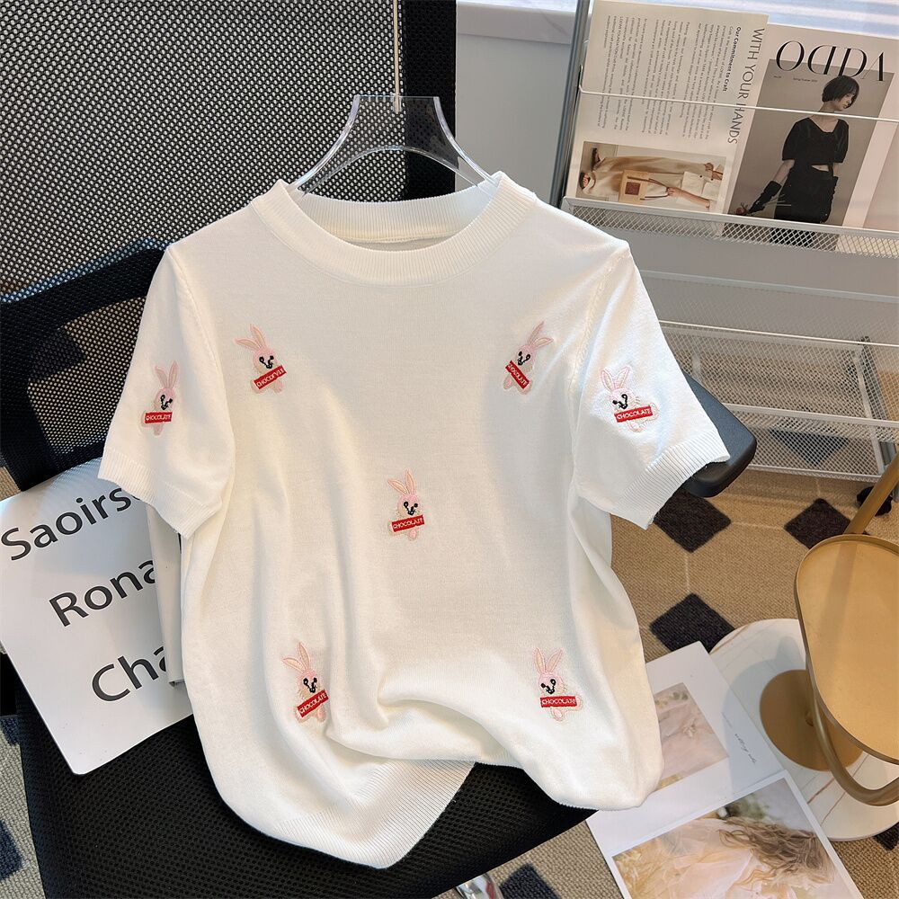 Gejia モールの同じスタイルの女性の 2025 夏バニー刺繍アイスシルク半袖 T シャツ女性のためのルーズで多用途