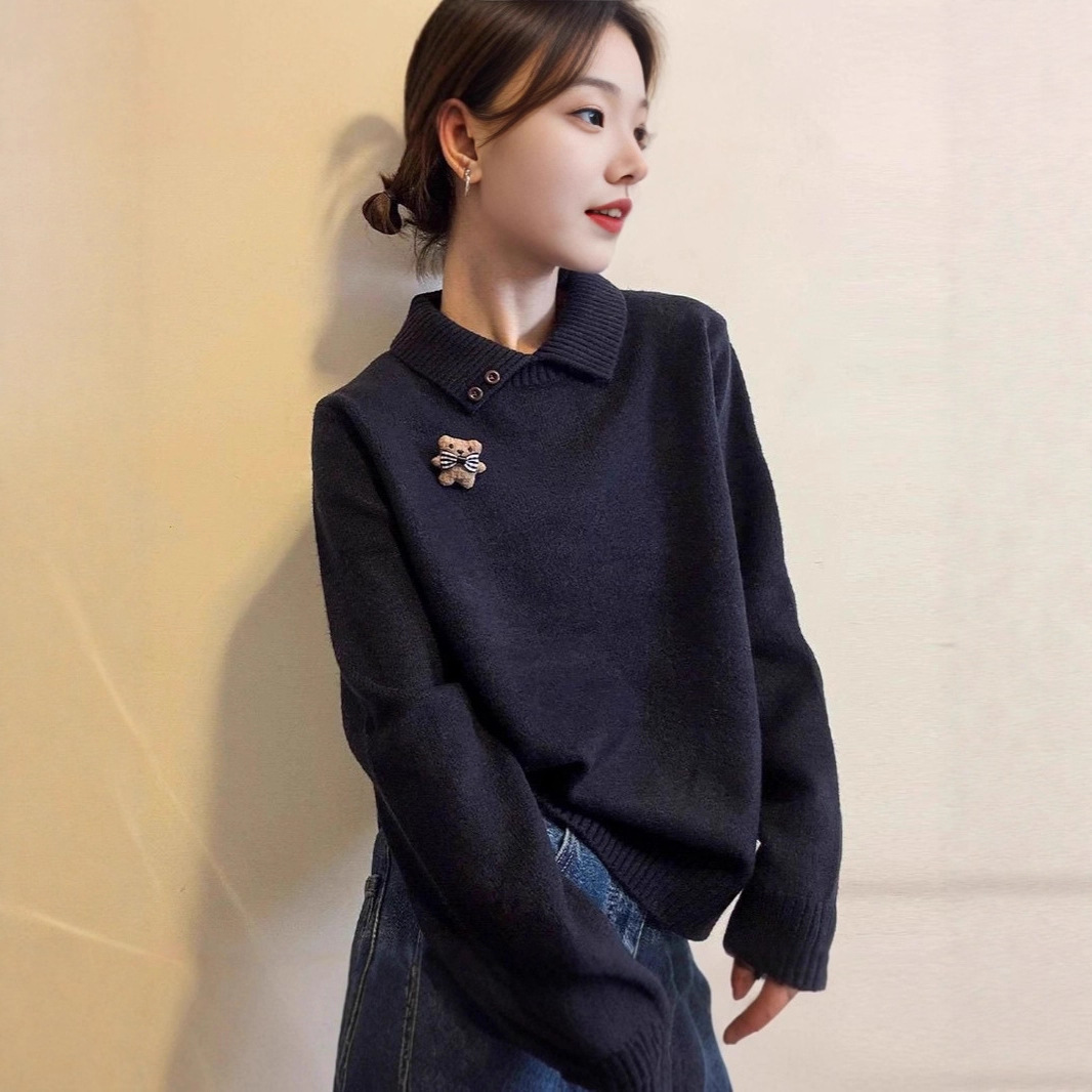哥家专柜品质秋冬秋冬新款POLO领卡通设计感小众洋气毛衣打底衫女