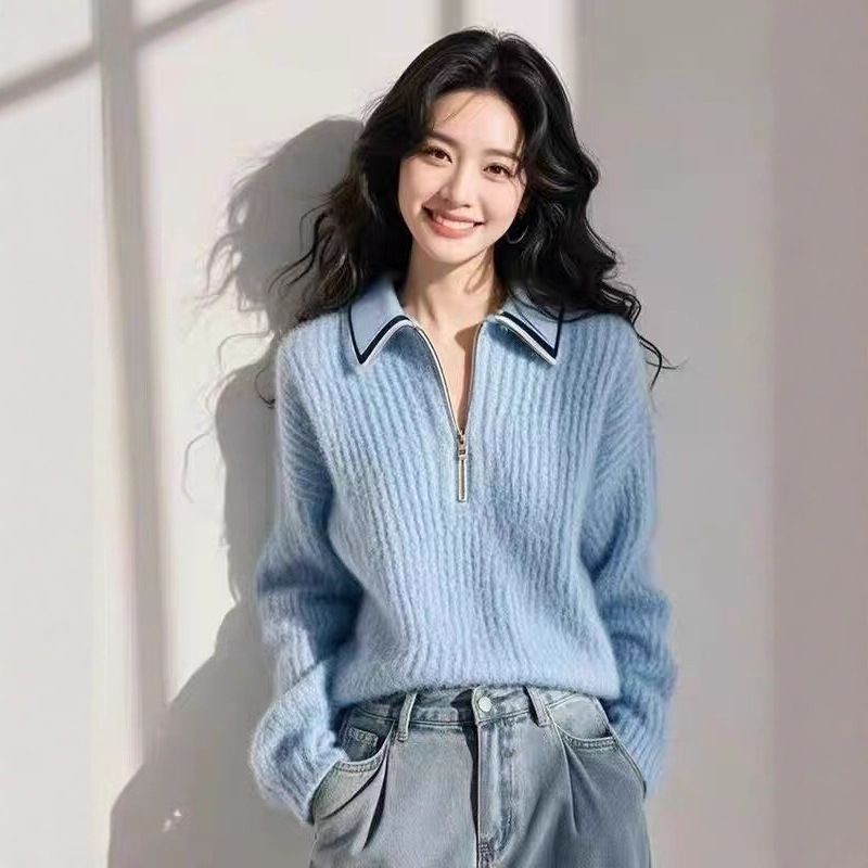 哥家商场同款女装2025秋季新款女翻领拉链毛衣宽松针织打底
