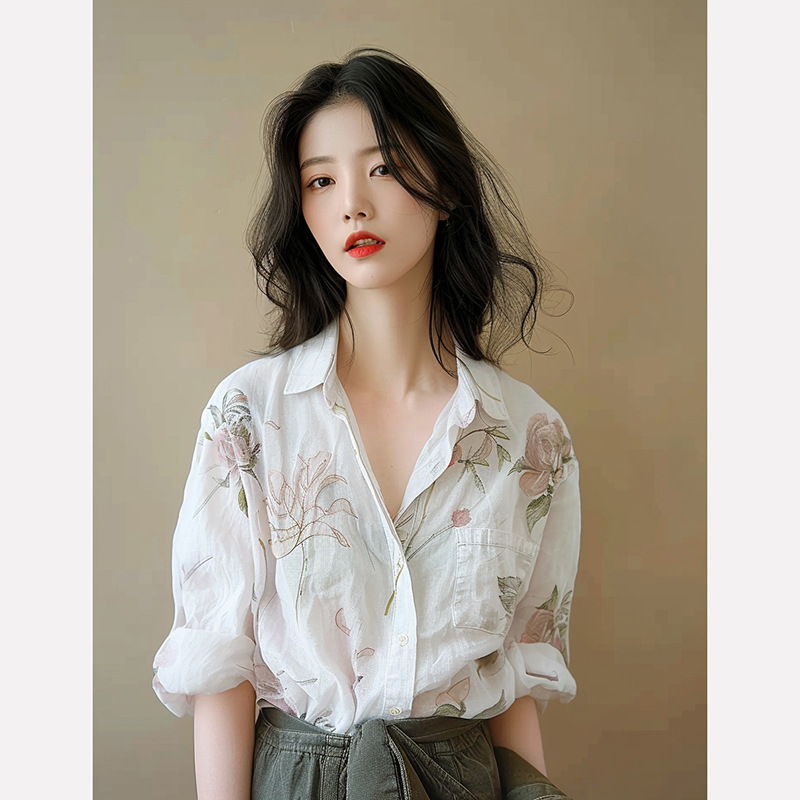 Gejiaショッピングモールの2025年夏の女性用コールドスタイルハイエンドプリントコットンとリネントップス、軽くて大人なフレンチシャツ