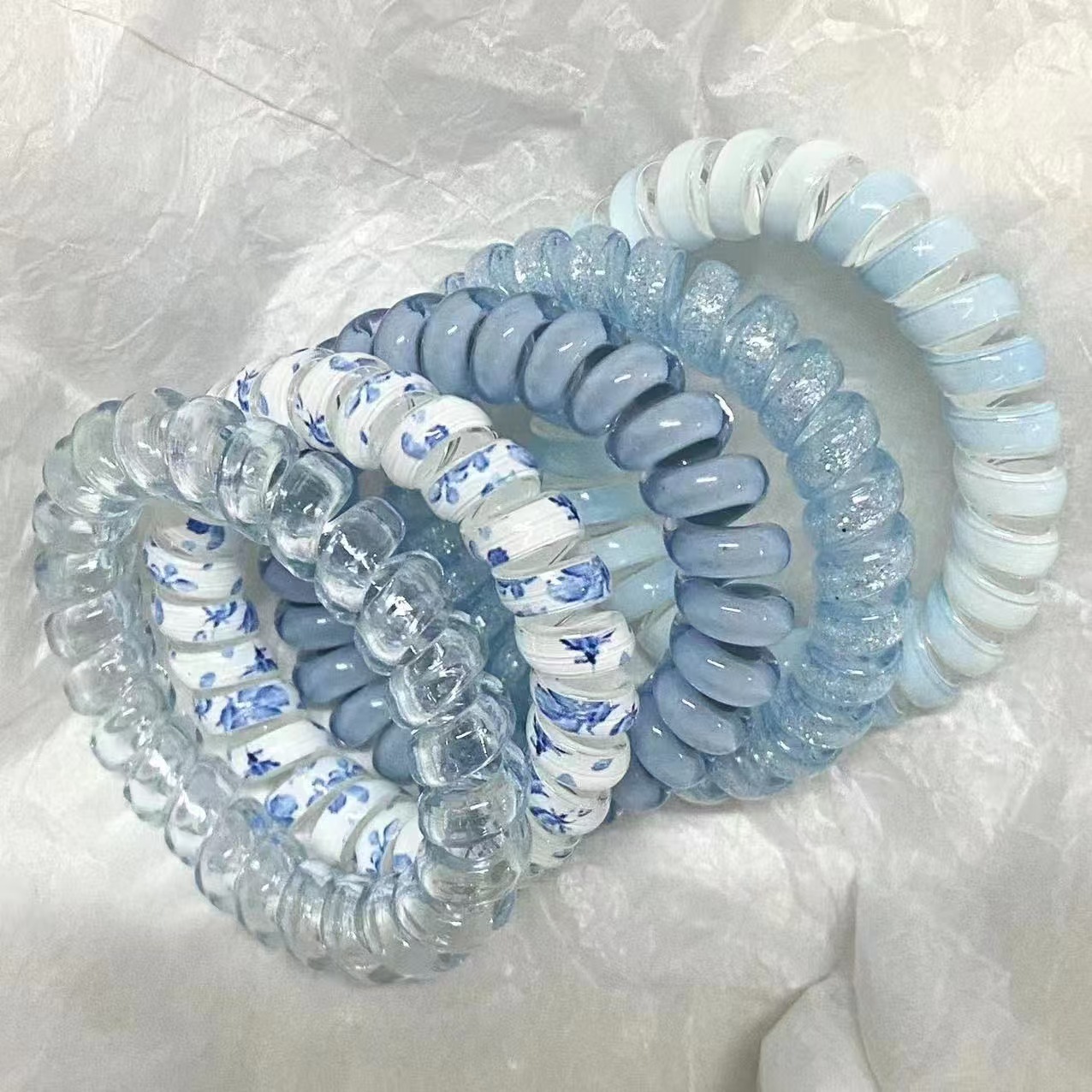 爆発的な透明な電話線と小さな輪ゴムのひもを混ぜた女性の電話輪のひも