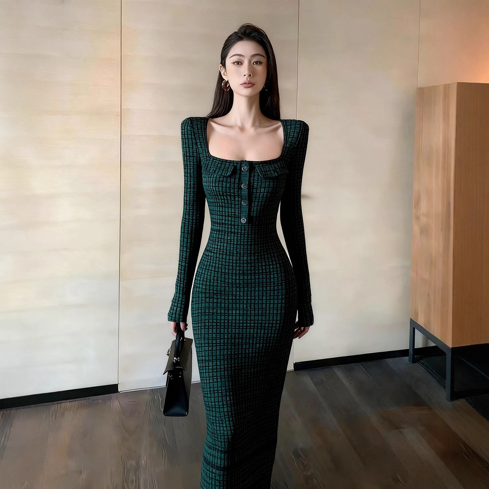 秋装女2025新款法式方领长袖针织连衣裙女修身显瘦气质小香风长裙