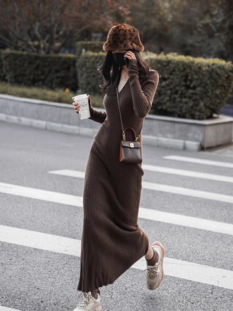 早秋の優しい風は気質の女神のvネックのニットのロングスカートの高級なシンプルなデザイン感の長袖のワンピースを着ます。