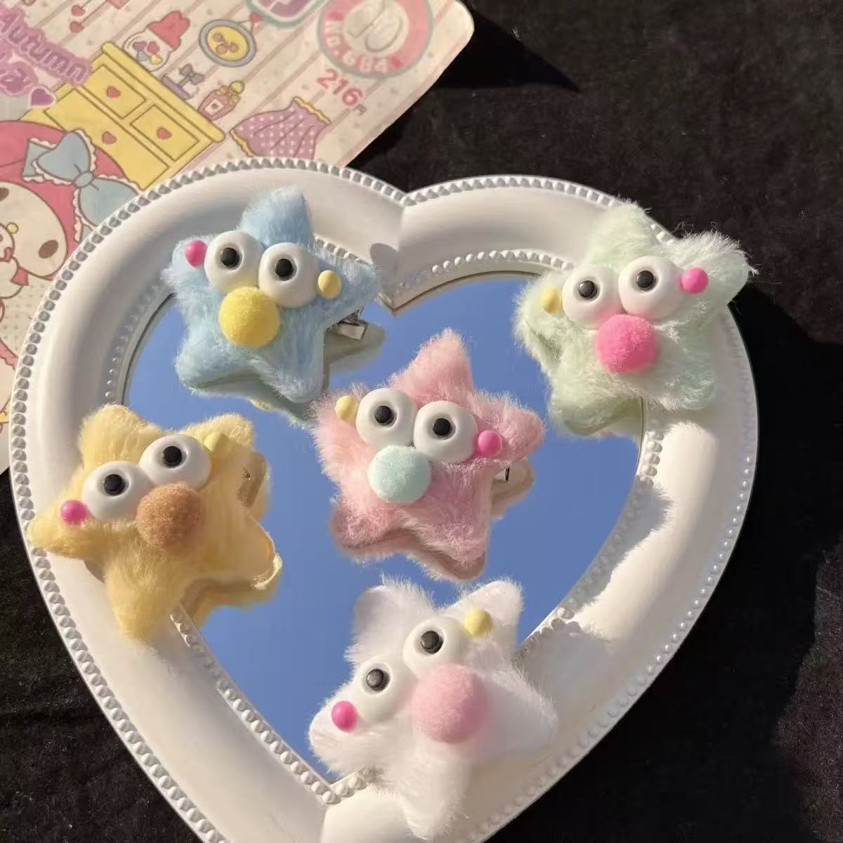 アニメのぬいぐるみの星のヘアピン秋冬の毛がふわふわしています。