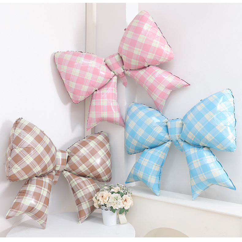韩版方格蝴蝶结造型铝膜气球宝宝周岁生日派对装饰布置场景气球