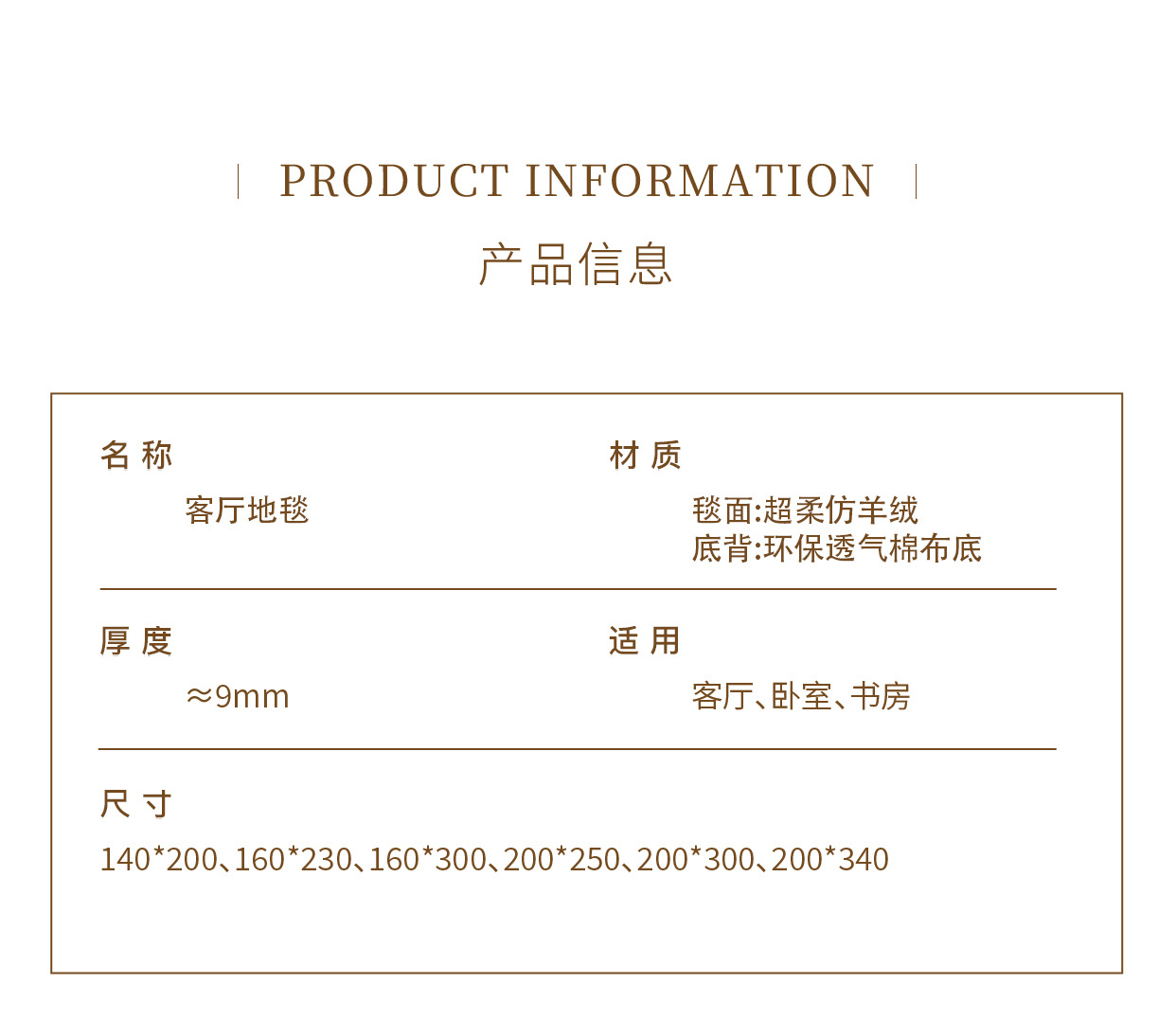 尺寸 60x160cm,120x160cm【可上扫地机器人】,140x200cm【防水防污好打理】,160x230cm【凝水毯面易清洁】,160x300cm【适合中小型客厅】,200x250cm【适合3人或L型沙发】,200x300cm【客厅大尺寸推荐!】,200x340cm【适合3人或L型沙发】,240x360cm【适合4人或L型沙发】,240x400cm【适合4人或L型沙发】,300x400cm【适合超大客厅】,定制不支持退换联系客服,300cm×400cm【优选羊脂绒★客厅满铺】