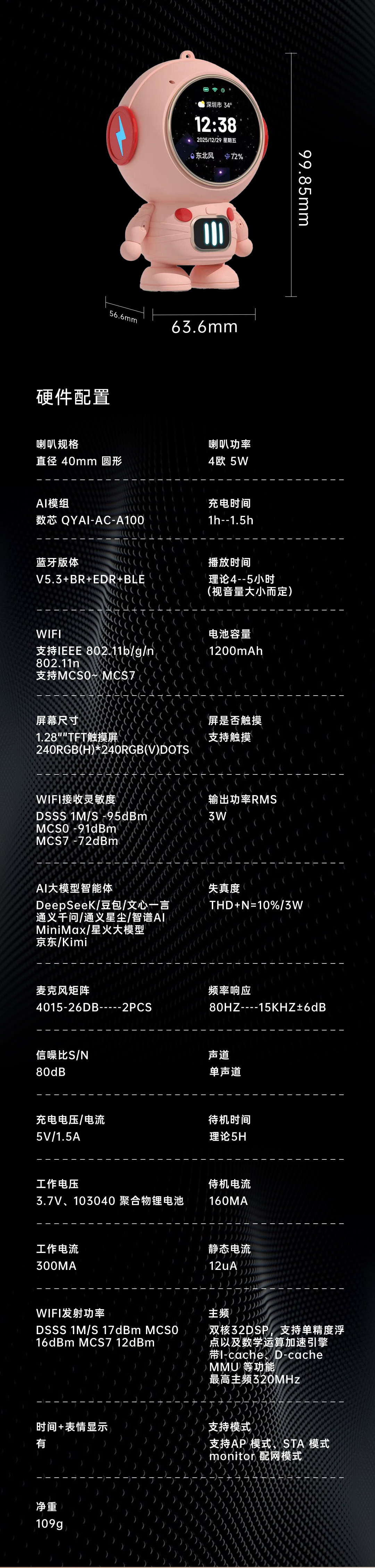 材质:ABS+电镀+硅胶 音频输出功率:3W(RSM)LCD 屏幕:1.28"TFT触摸屏失真度:THD+N=1频率响应:80HZ-15KHZ+6dB蓝牙版本:V5.3+BR+EDR+BLEW 环阶继:投村:2E:2.90//n802.11n支持MCS0~MCS7 大模型:轻语AI 充电输入:5V/1.5A工作电压:3.7V/聚合物锂电池电池容量:1200mAh