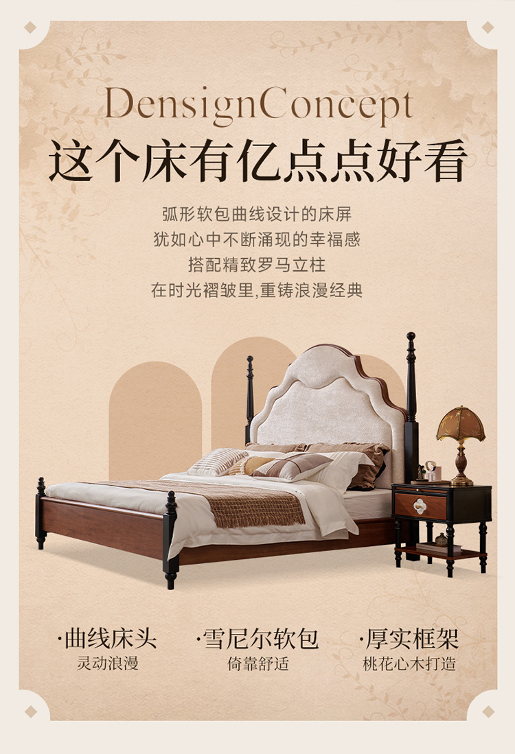 法式中古风实木床1.8米美式复古双人床主卧轻奢简约软包婚床大床