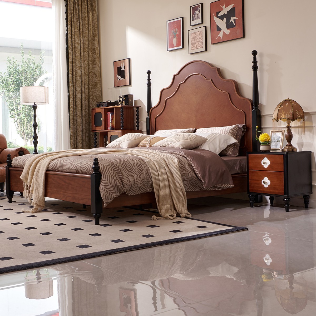 アメリカンレトロ全無垢材ベッドフレンチミッドセンチュリースタイル1.8mダブルベッドマスターベッドルームチェリー色の高級アンナベッド