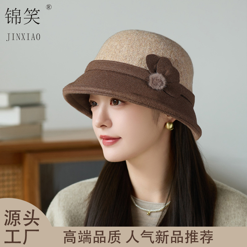 秋冬新款毛呢拼接盆帽女时尚百搭保暖帽子韩版优雅显脸小渔夫帽